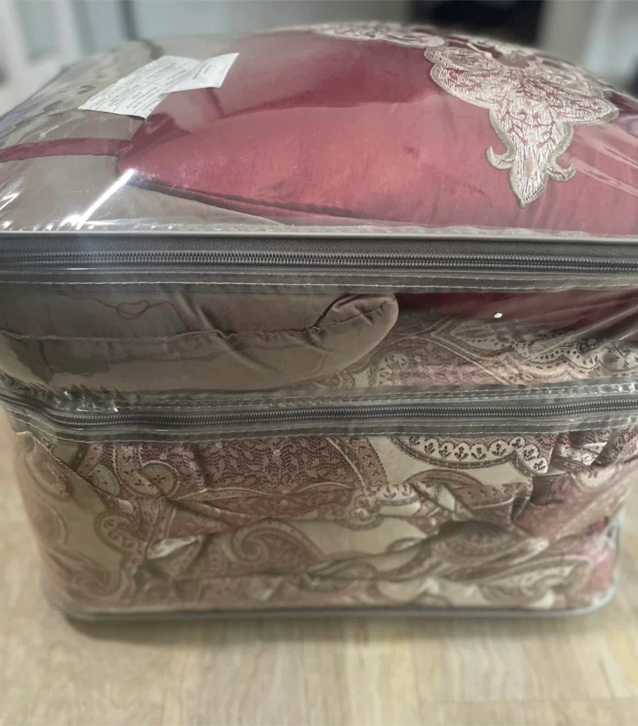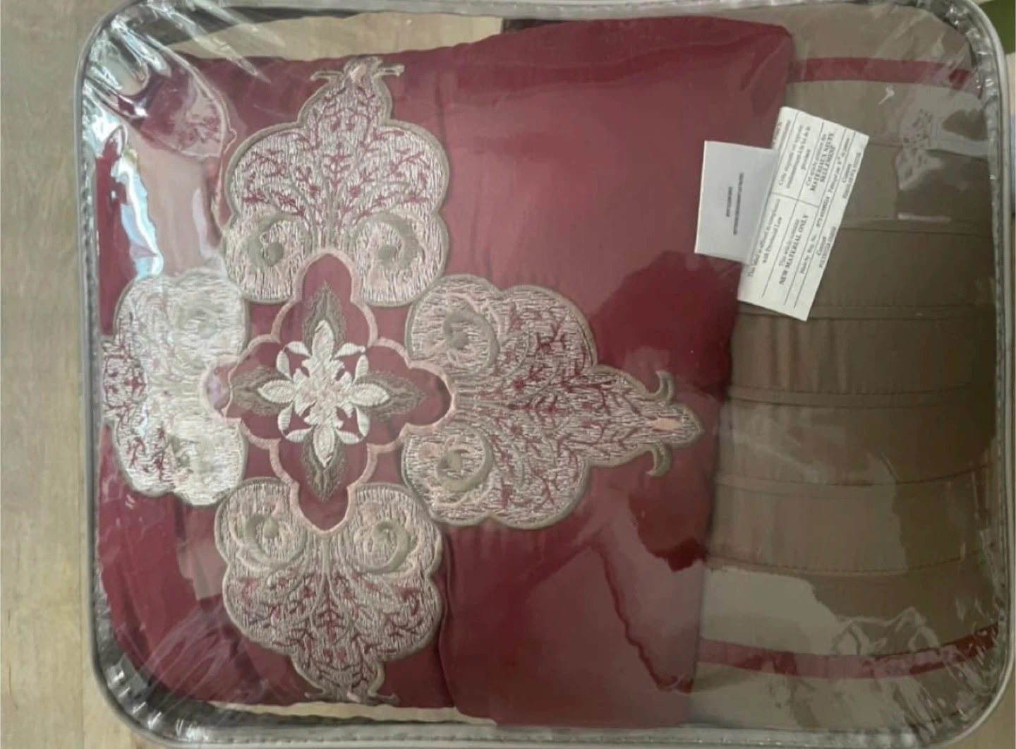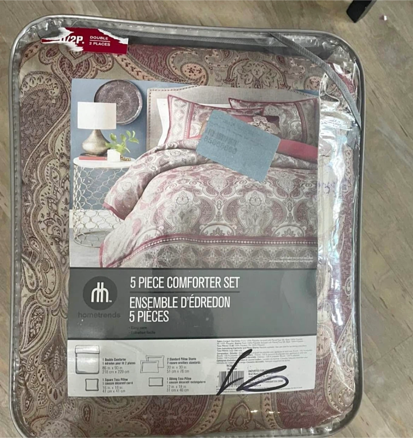 Selling a brand new Hometrends 5-piece comforter set! It includes a double comforter, two standard pillow shams, one square toss pillow, and one oblong toss pillow. Perfect for adding a touch of elegance to your bedroom. Never used