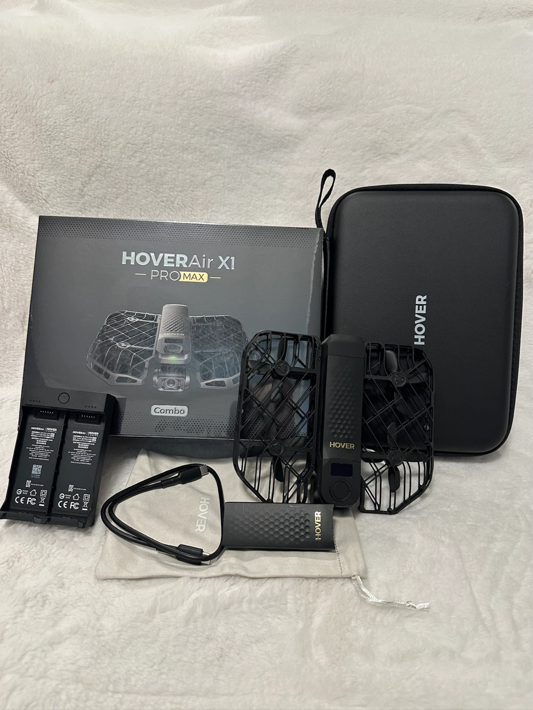 This is the HOVERAir X1 ProMax Combo drone kit. It includes the drone, two batteries, a charging cable, and a carrying case. It's designed for effortless aerial photography.