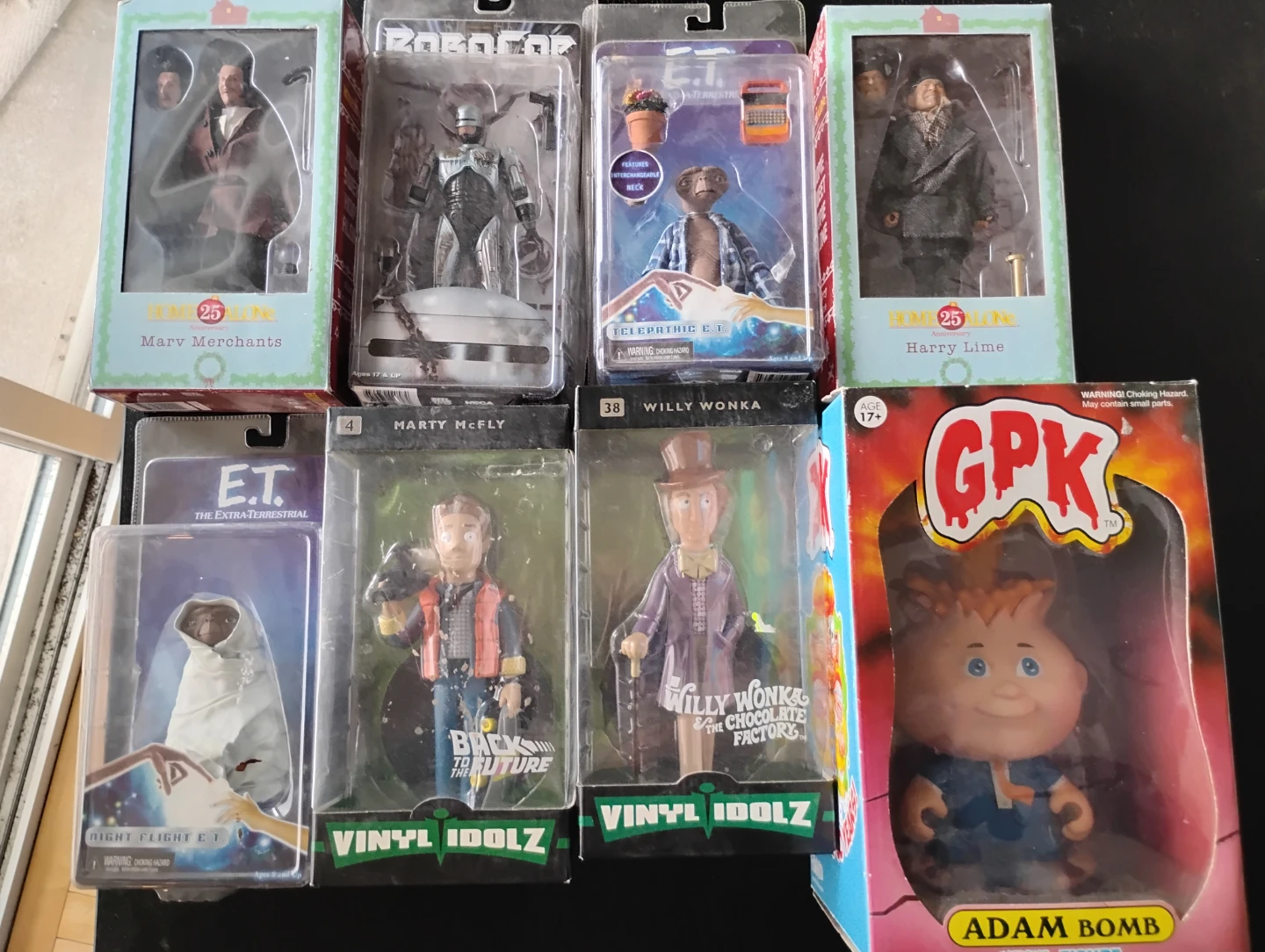 Vinyl Idolz action figures from popular movies. Includes E.T. (Night Flight and Telepathic), Marty McFly from Back to the Future, Willy Wonka, Robocop, Marv Merchants, and Harry Lime. These figures are great for collectors of movie memorabilia.