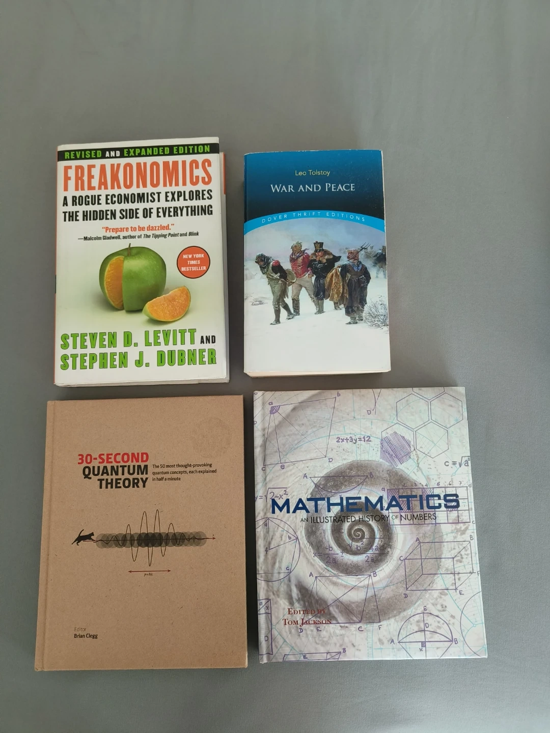 A set of four books including 'Freakonomics' by Steven D. Levitt and Stephen J. Dubner, 'War and Peace' by Leo Tolstoy, '30-Second Quantum Theory' edited by Brian Clegg, and 'Mathematics: An Illustrated History of Numbers' edited by Tom Jackson. These are all paperback editions.