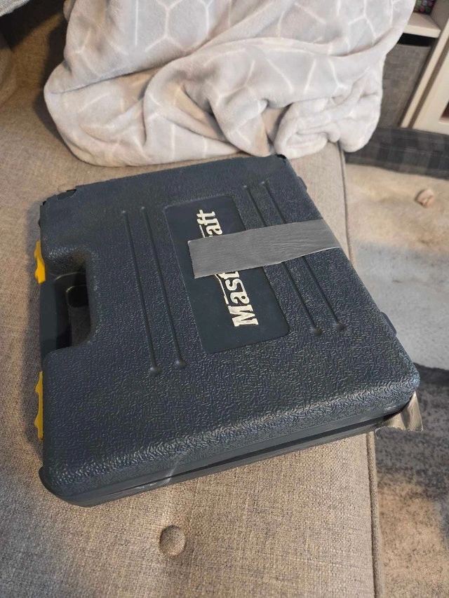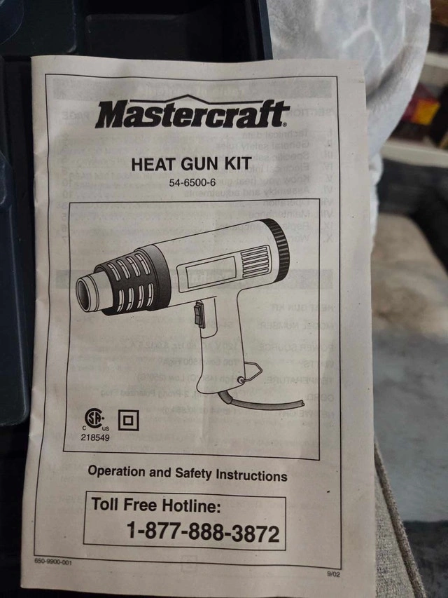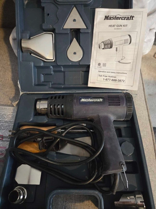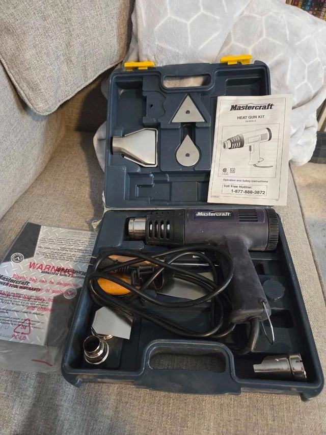 This is a Mastercraft heat gun kit, perfect for various tasks requiring controlled heat. It has been used and shows some signs of wear, but is in good working condition. It includes multiple attachments and the original case, making it a versatile addition to any workshop. Included attachments: Deflector Nozzle, Surface Nozzle, Cone Nozzle, Reduction Nozzle.
