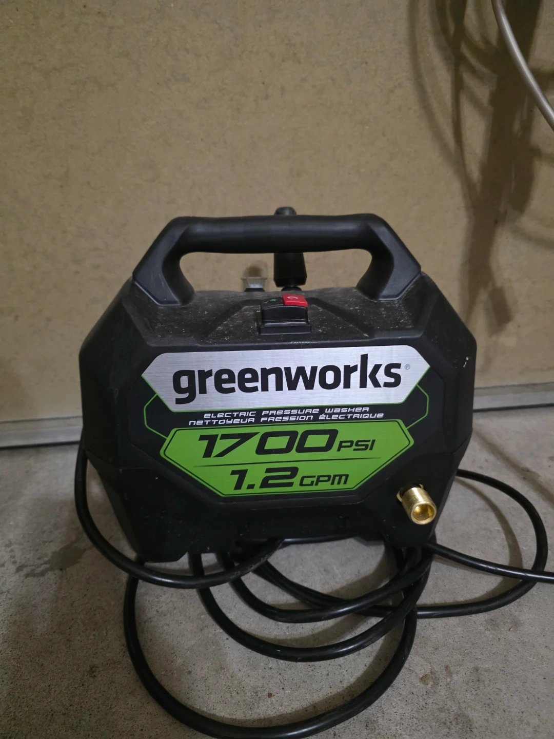 This is a Greenworks electric pressure washer with 1700 PSI and 1.2 GPM. It includes the main unit and the spray wand. Great for general cleaning tasks around the house!