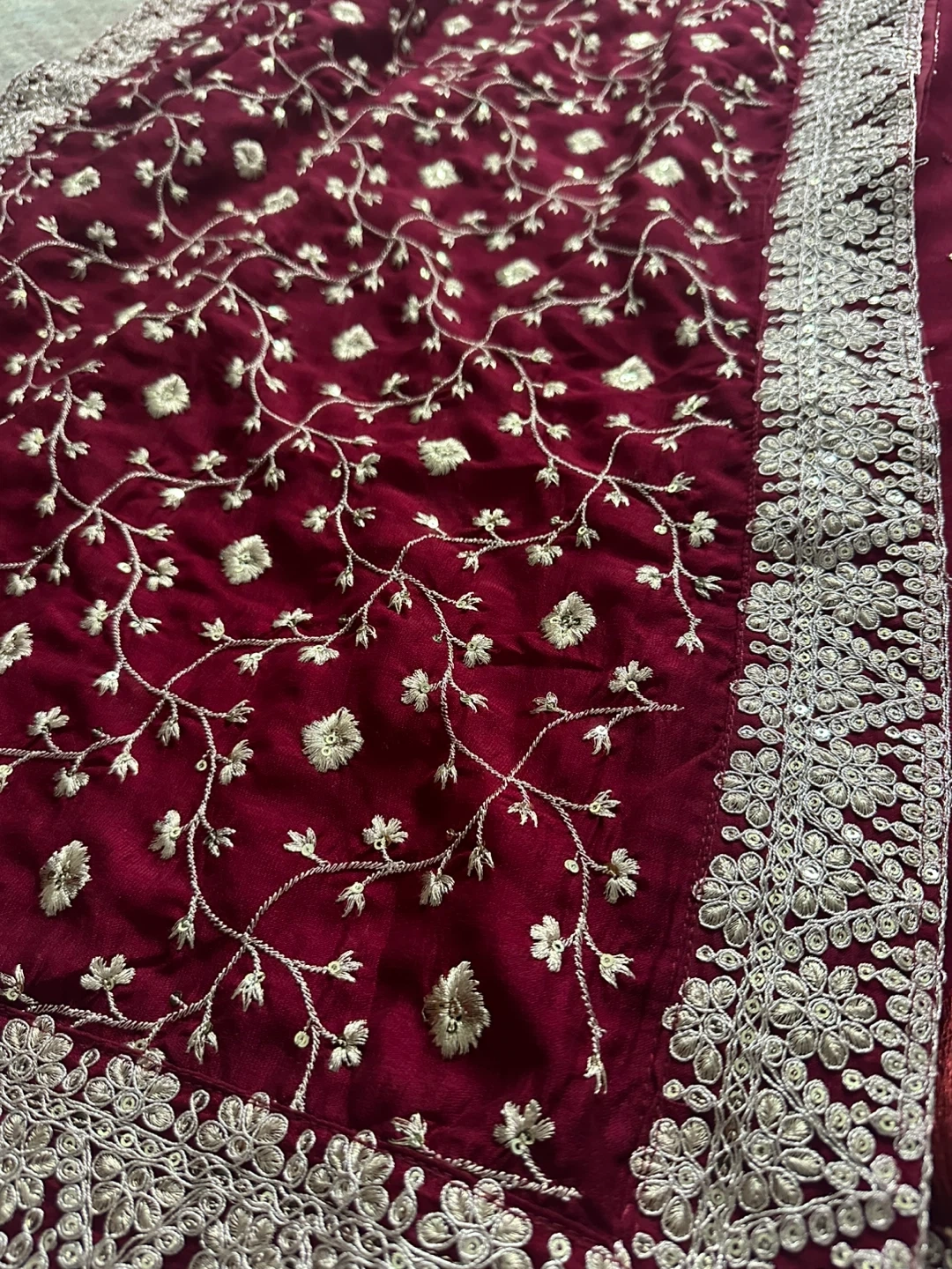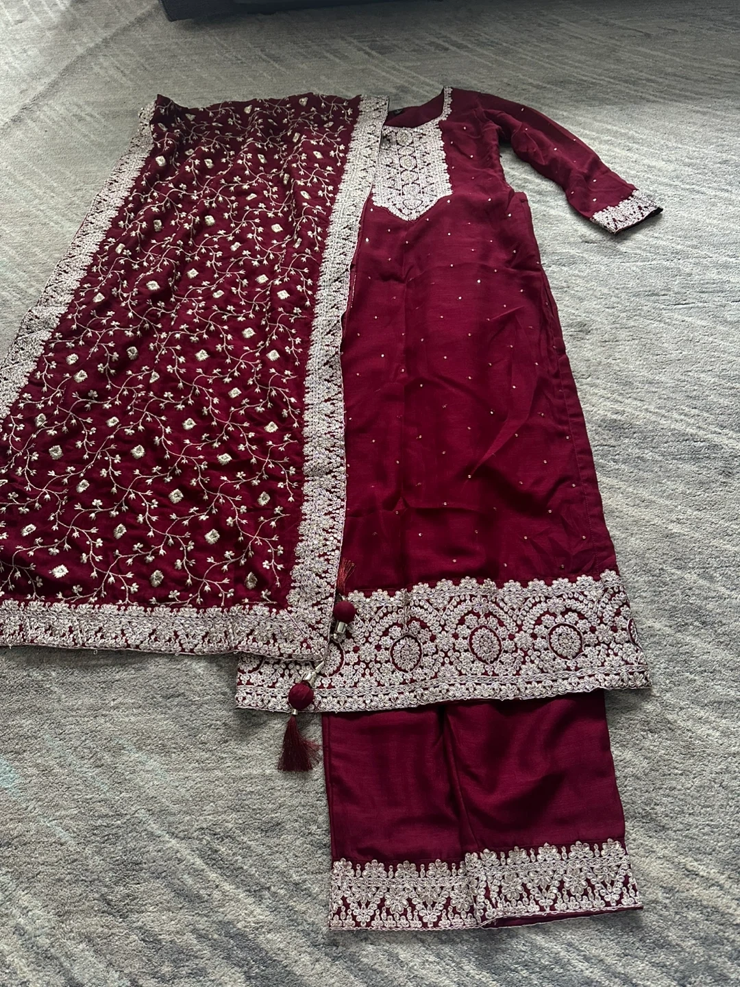 Gorgeous maroon 3-piece outfit with intricate silver embroidery. It features a long dress with matching pants, and a detailed dupatta. Perfect for special occasions! Worn only once for couple of hours. 125 Cash pickup at Keele and eglinton