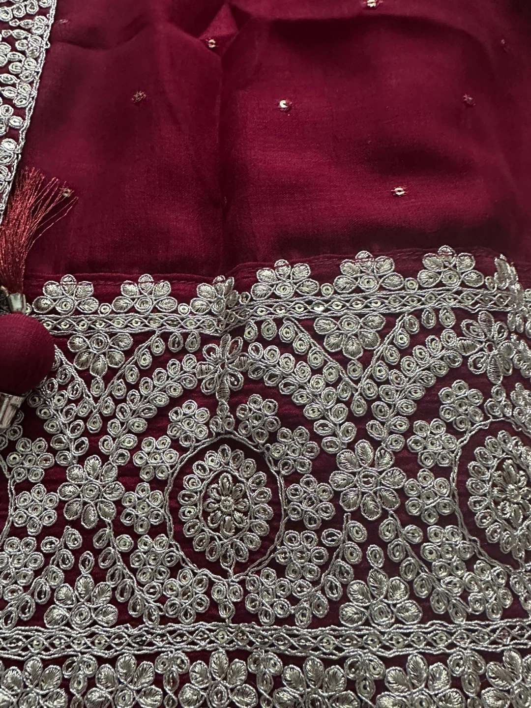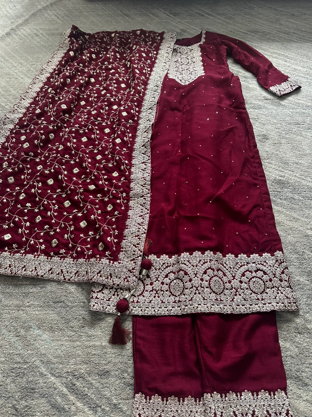 Gorgeous maroon 3-piece outfit with intricate silver embroidery. It features a long dress with matching pants, and a detailed dupatta. Perfect for special occasions! Worn only once for couple of hours. 125 Cash pickup at Keele and eglinton