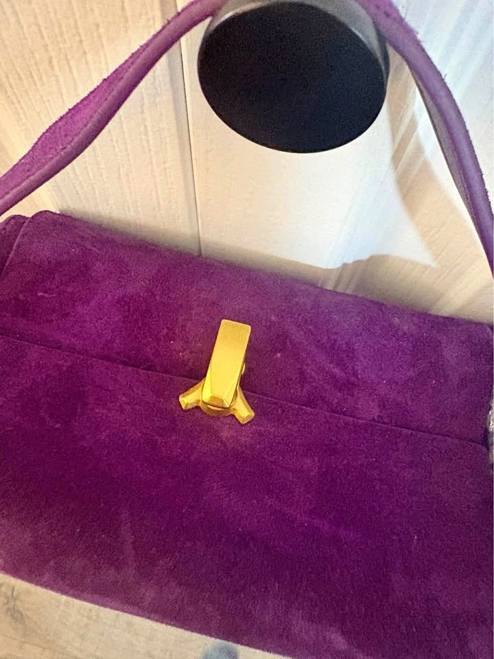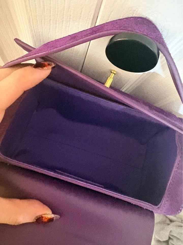 Vibrant purple shoulder bag made of super soft suede material. Features a gold clasp detail on the front and an adjustable strap. The inside is also purple and offers good space for your belongings.