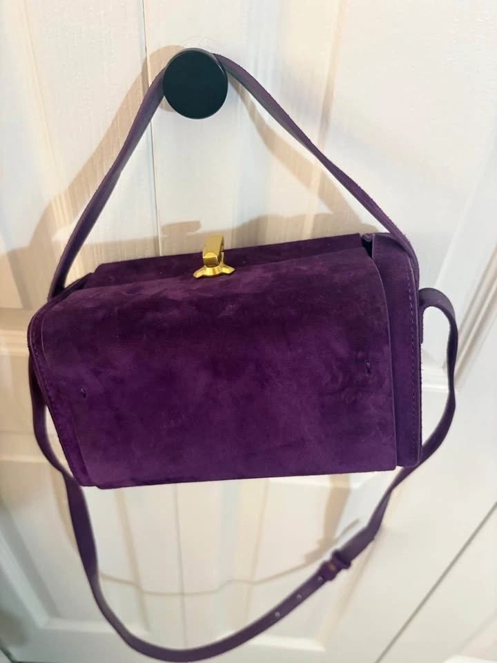 Vibrant purple shoulder bag made of super soft suede material. Features a gold clasp detail on the front and an adjustable strap. The inside is also purple and offers good space for your belongings.