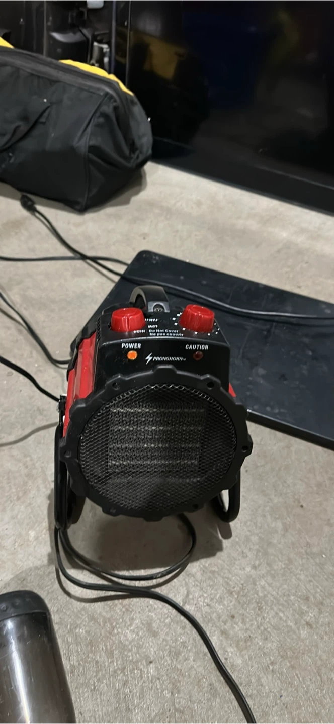 This is a red and black Pronghorn portable heater. It has multiple heat settings and a fan-only option. It's a compact and useful unit for small spaces.