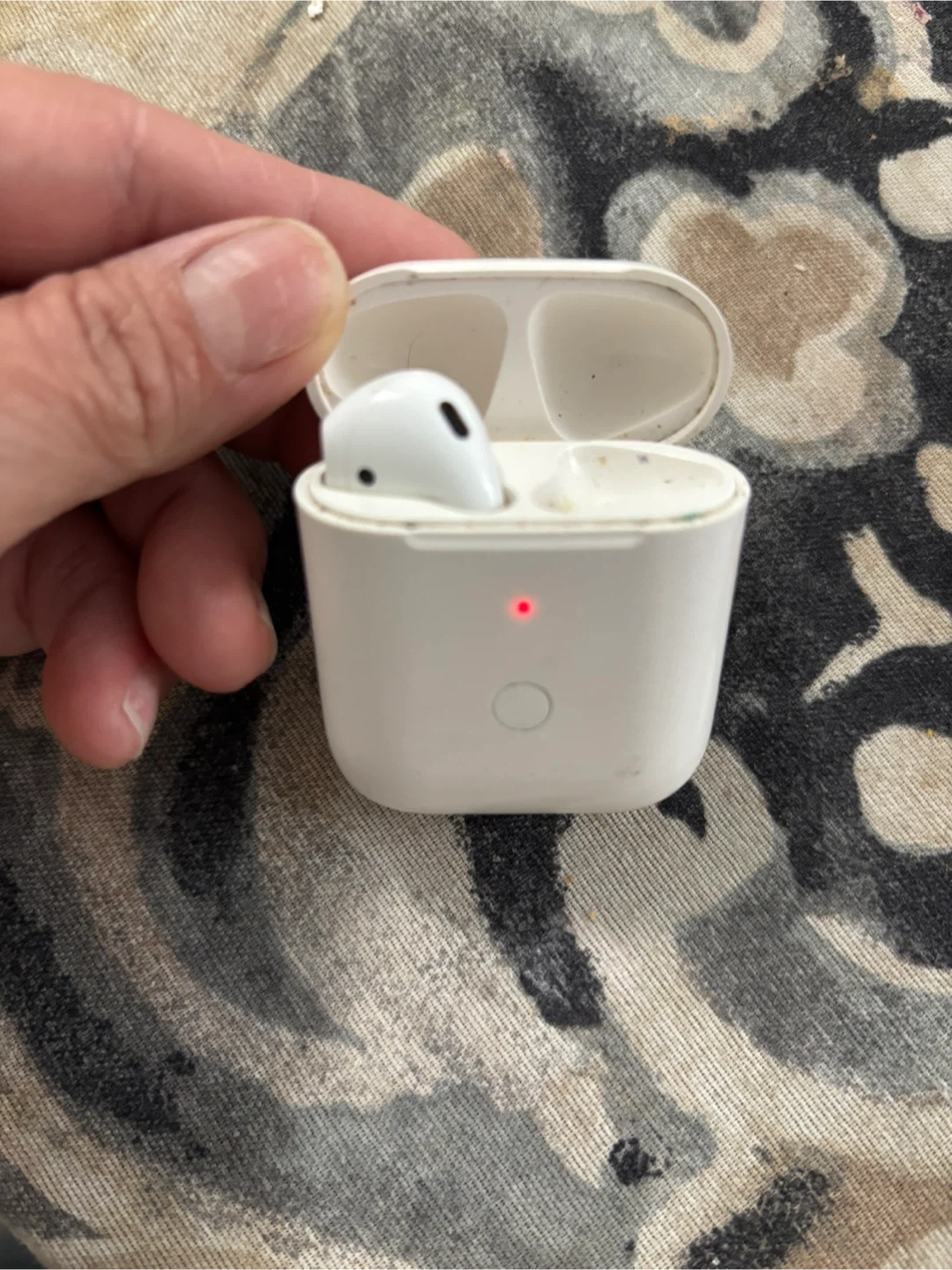 White wireless earbuds with a charging case. The case supports wireless charging. Includes one earbud and the charging case.