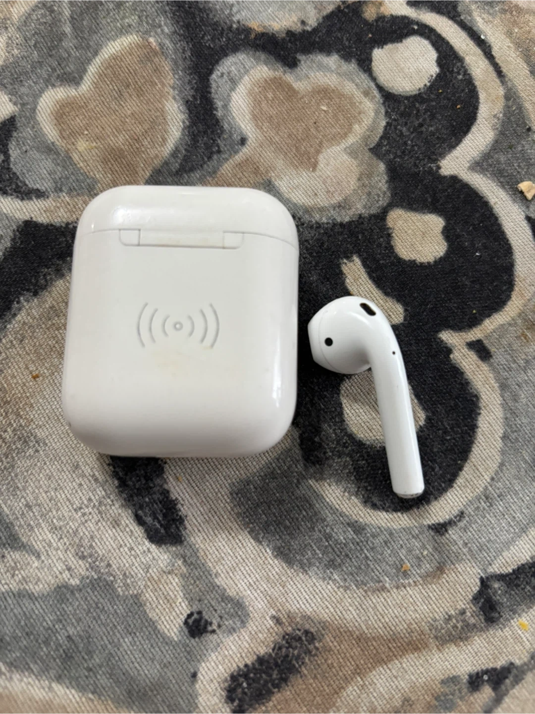 White wireless earbuds with a charging case. The case supports wireless charging. Includes one earbud and the charging case.