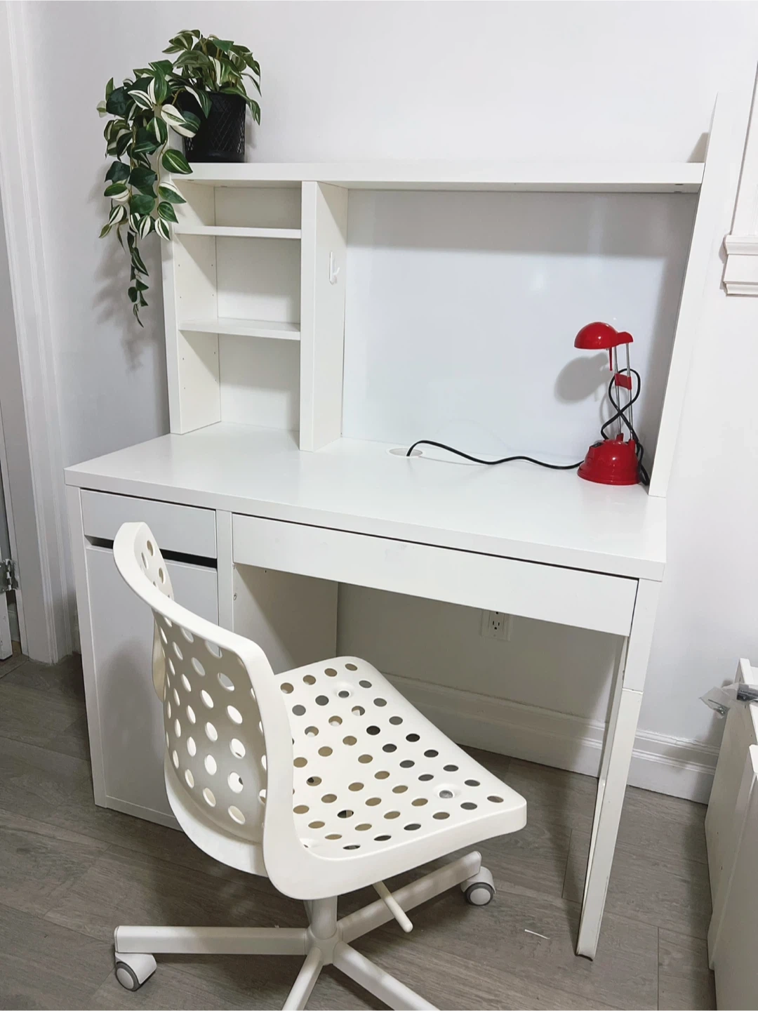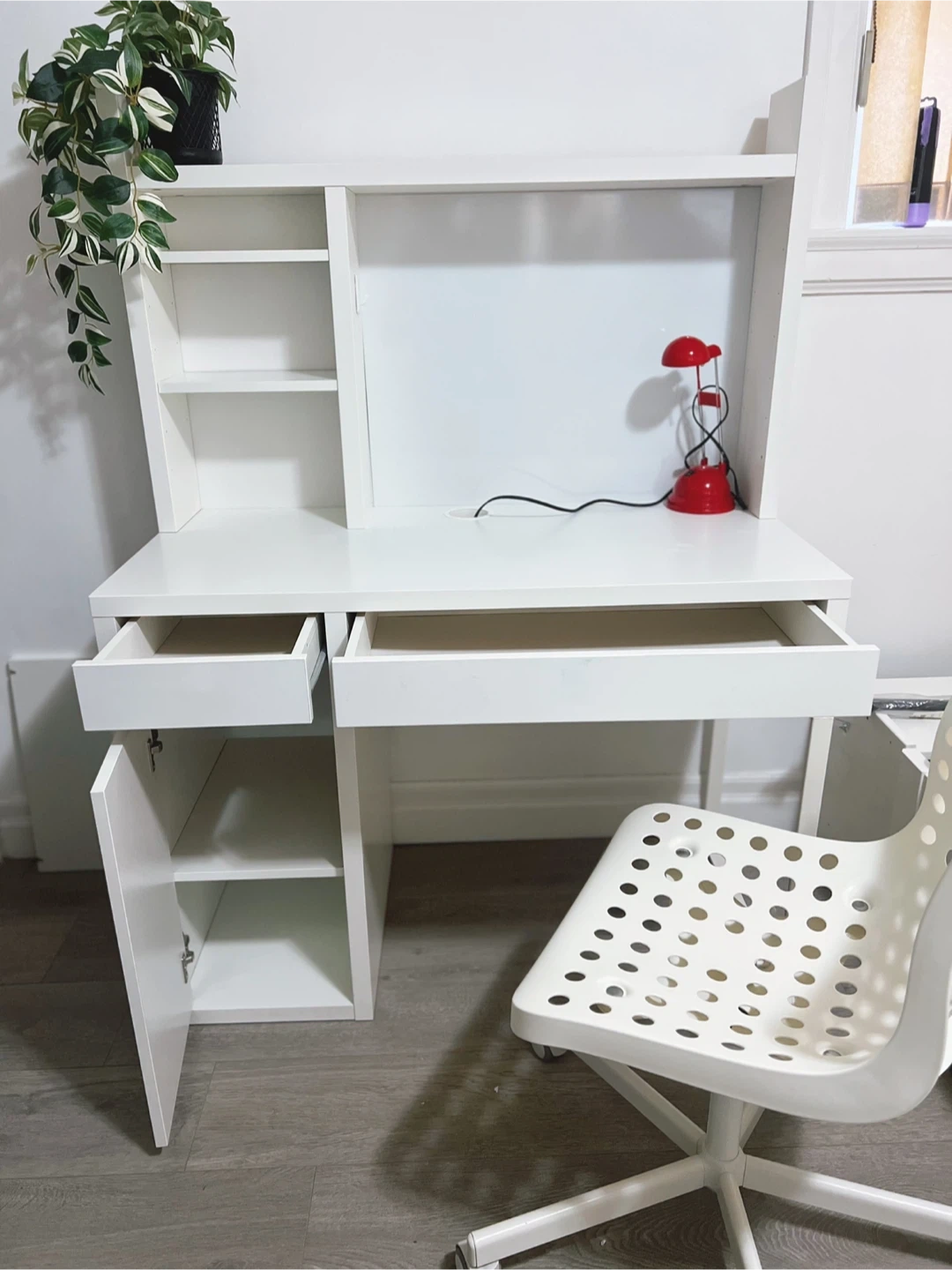 Spacious white IKEA Micke desk. Has a hutch with shelves on one side and a wide open space. Also has two drawers and a cabinet with a shelf on the left side. Comes with a comfy white swivel chair on wheels. Great for a home office or student room.