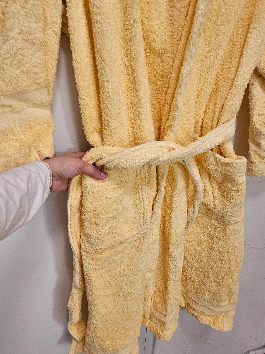 Soft terry cloth bathrobe in a cheerful yellow hue. It's a classic wrap style with a belt and two front pockets. Perfect for lounging around the house or after a bath!