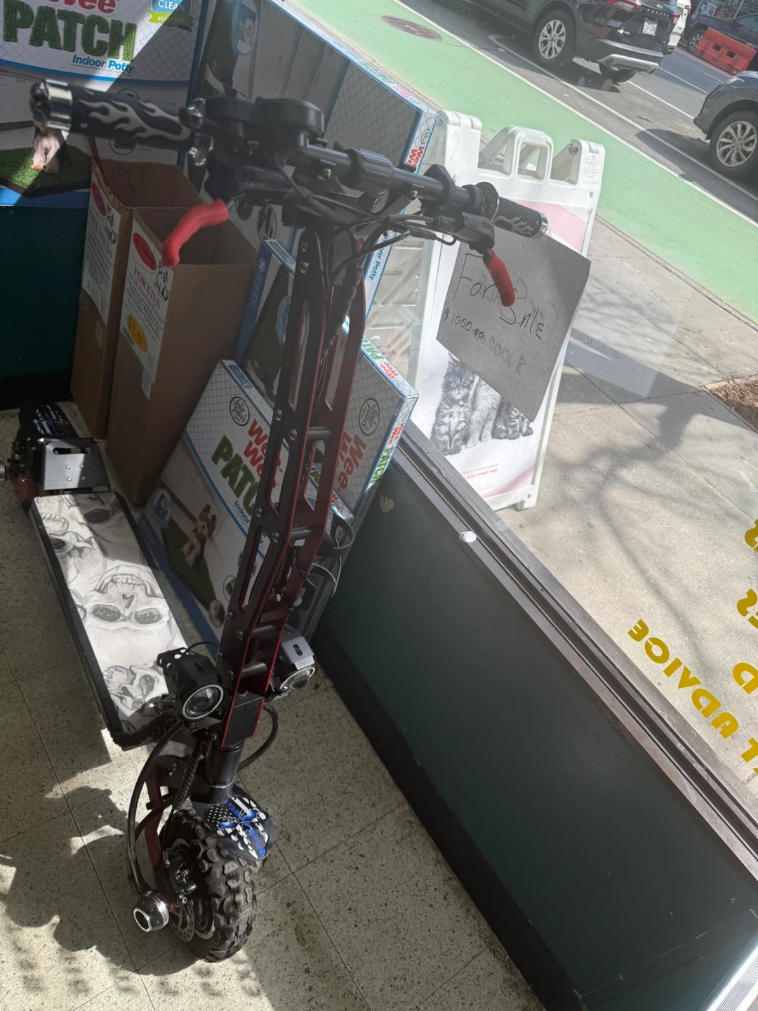 This is an electric scooter featuring a striking skull graphic on its deck. It has a dark red frame and black handlebars with red grips. The scooter appears to have dual suspension and rugged tires, suggesting it's designed for varied terrain. It includes headlights and taillights for visibility.