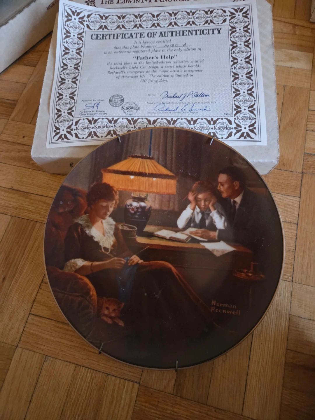 This is the limited edition collector plate "Father's Help" by Norman Rockwell. It's the third in The Rockwell's Light Campaign Series, made in an edition strictly limited to one hundred fifty firing days. Certified as a "True Rockwell Classic" by the Rockwell Society of America.
