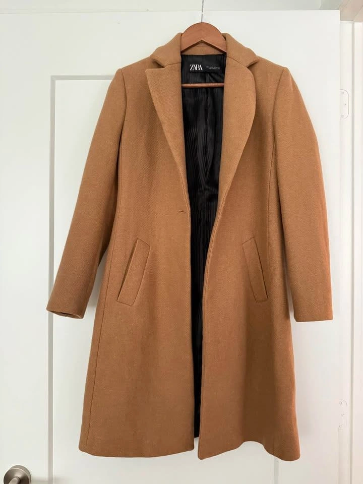 Classic ZARA camel/tan long coat in excellent preowned condition. Timeless, structured, and easy to dress up or down—perfect for fall, winter, and early spring.