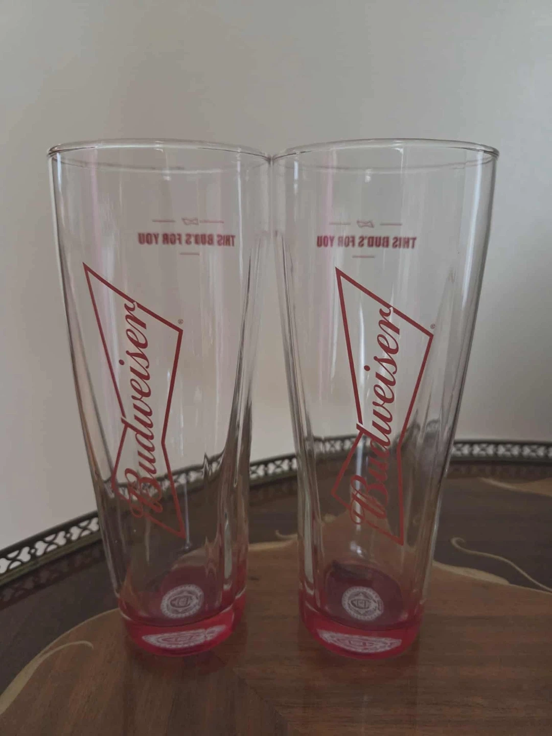 Elevate your home bar with this classic set of Budweiser Pilsner Glasses. Featuring the iconic red bow-tie logo and the legendary "This Bud’s For You" slogan (printed in reverse on the back for that classic bar-mirror effect), these glasses are a must-have for any collector or beer enthusiast.