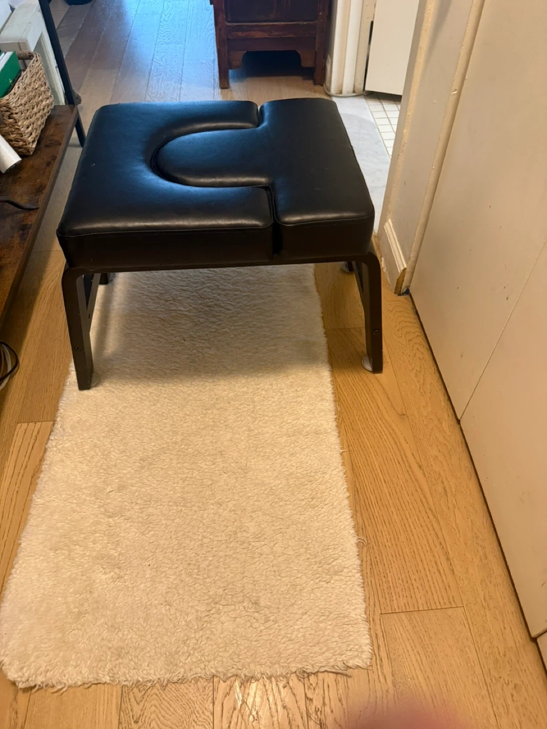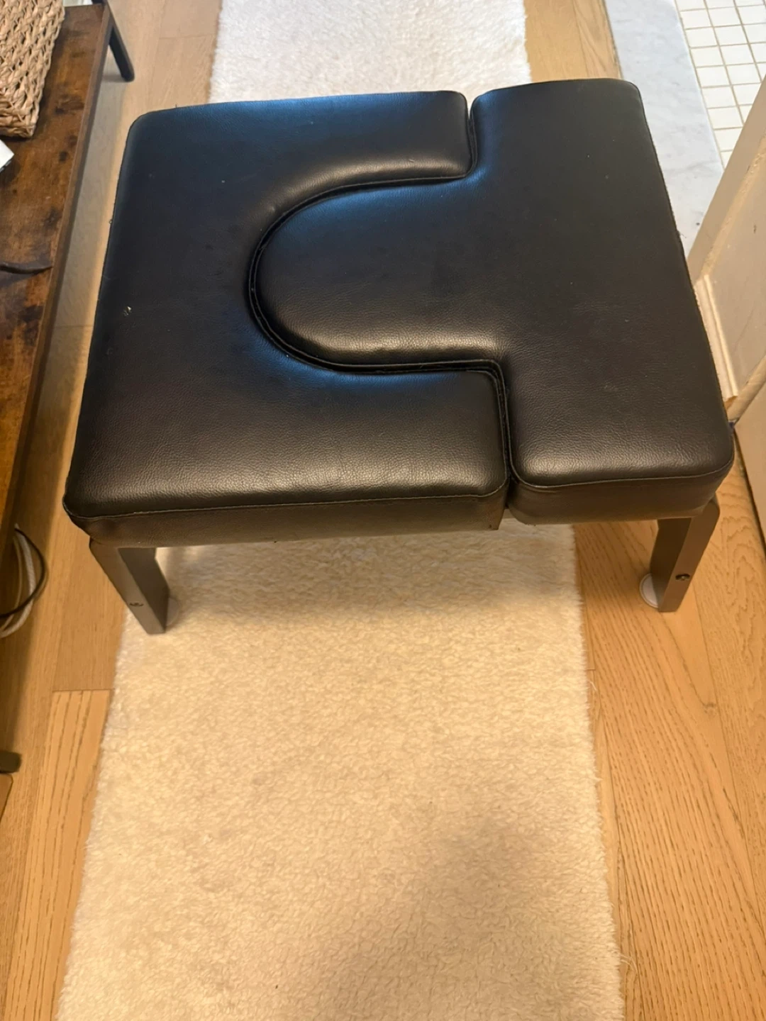 I'm selling a meditation bench with a unique U-shaped design! It is in good condition and is made of black material. Perfect for comfortable and focused meditation sessions