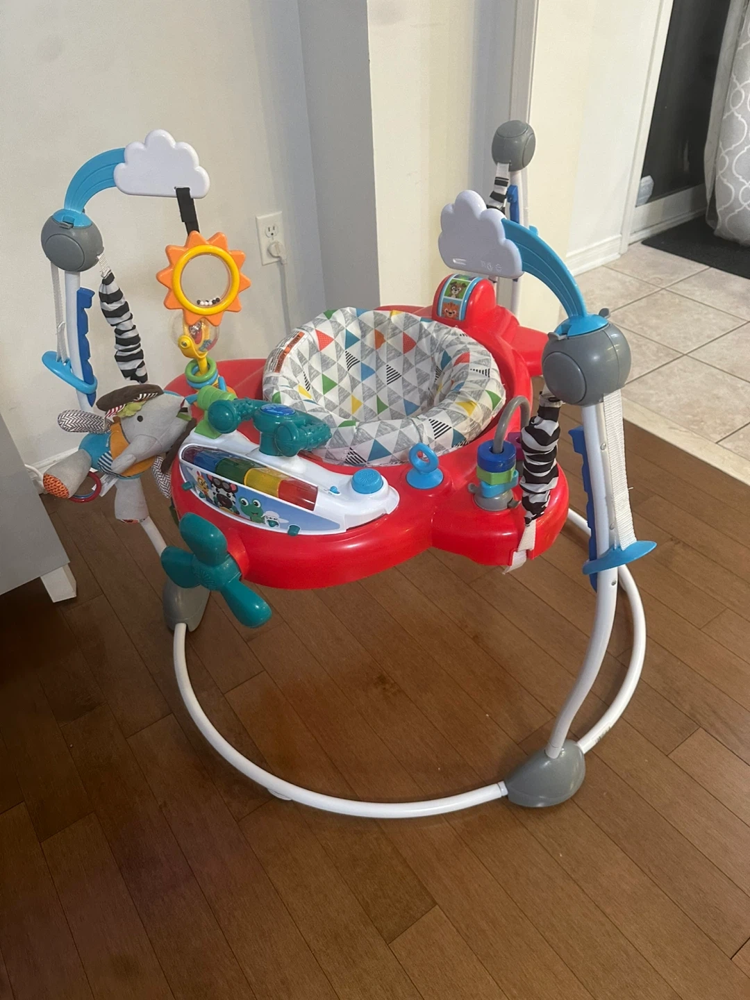 Fisher-Price Jumperoo with various engaging toys and activities for baby. It's designed for playtime and exploration. Some toys on the overhead bar may be missing.