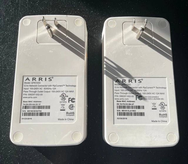 Selling a set of two Bell Arris GPE1003 G.hn Network Connectors. These adapters are used and show some cosmetic wear, but they are fully functional and ready to extend your network over existing power lines. They support speeds up to 1 Gbps, ideal for streaming, gaming, and connecting devices in hard-to-reach areas. The units work great. Specifications: Model: GPE1003, Technology: G.hn Network Connector with RipCurrent™ Technology, Input: 100-240V AC, 50/60Hz, 12A, Pass Through Outlet: 100-240V AC, 12A MAX. If the ad is up, then they are available!