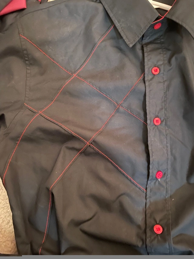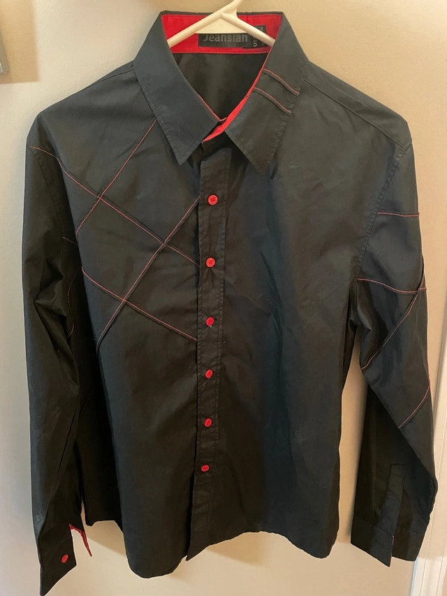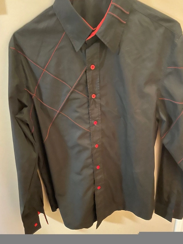 Men's black and red buttoned shirt, perfect condition, only worn a few times. Size is medium but because it’s slim fit, it will fit one size smaller, size small. Asking $40. Price is firm. From a bug-free, smoke-free, pet-free home. Pick up only in the South Pembina, Fort Richmond Area.