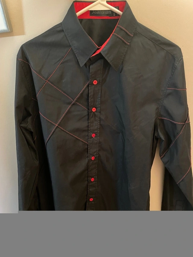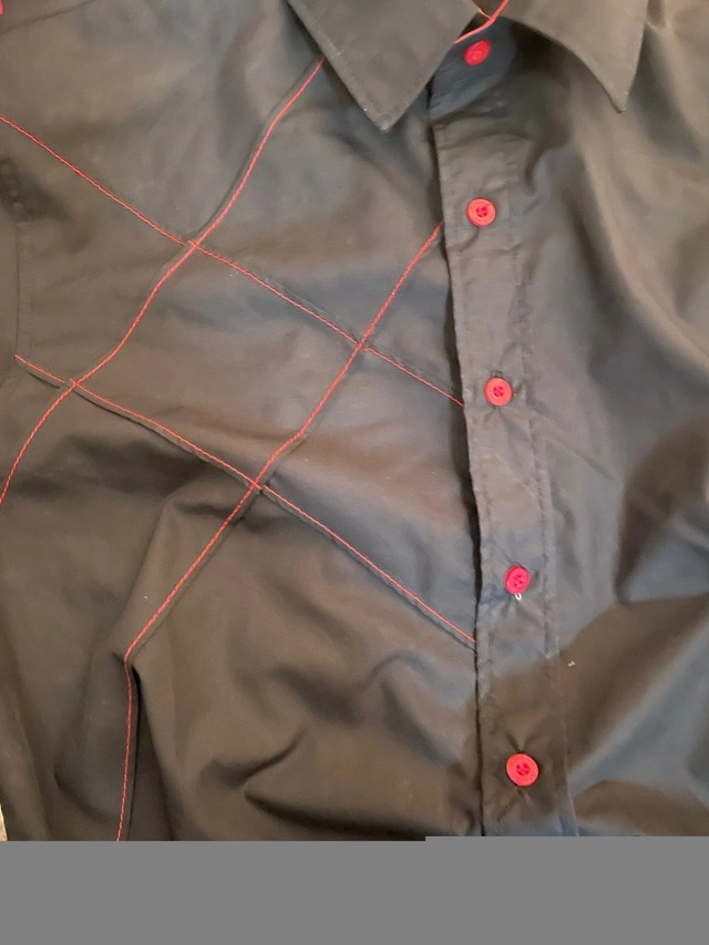 Men's black and red buttoned shirt, perfect condition, only worn a few times. Size is medium but because it’s slim fit, it will fit one size smaller, size small. Asking $40. Price is firm. From a bug-free, smoke-free, pet-free home. Pick up only in the South Pembina, Fort Richmond Area.