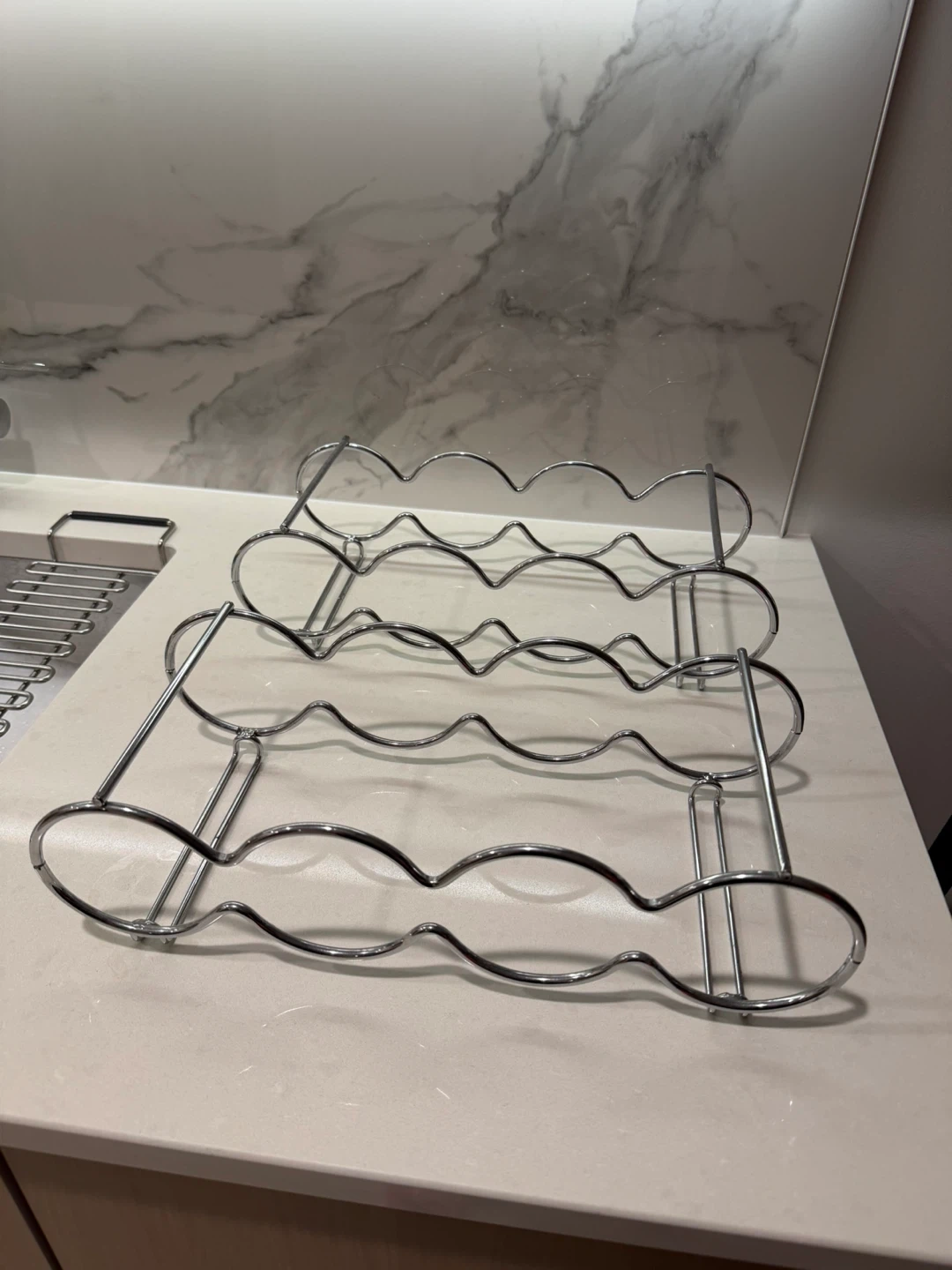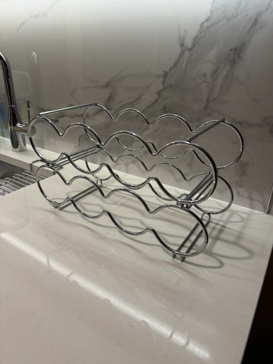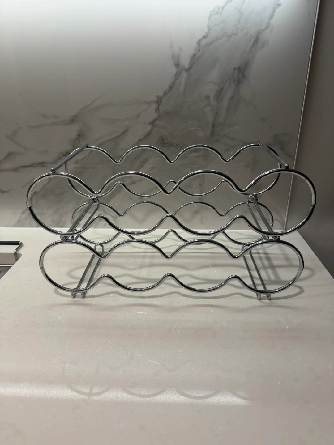 This is a chrome-plated metal wine rack that holds up to 8 bottles. It's a free-standing unit with a compact design. Great for kitchens or cellars!