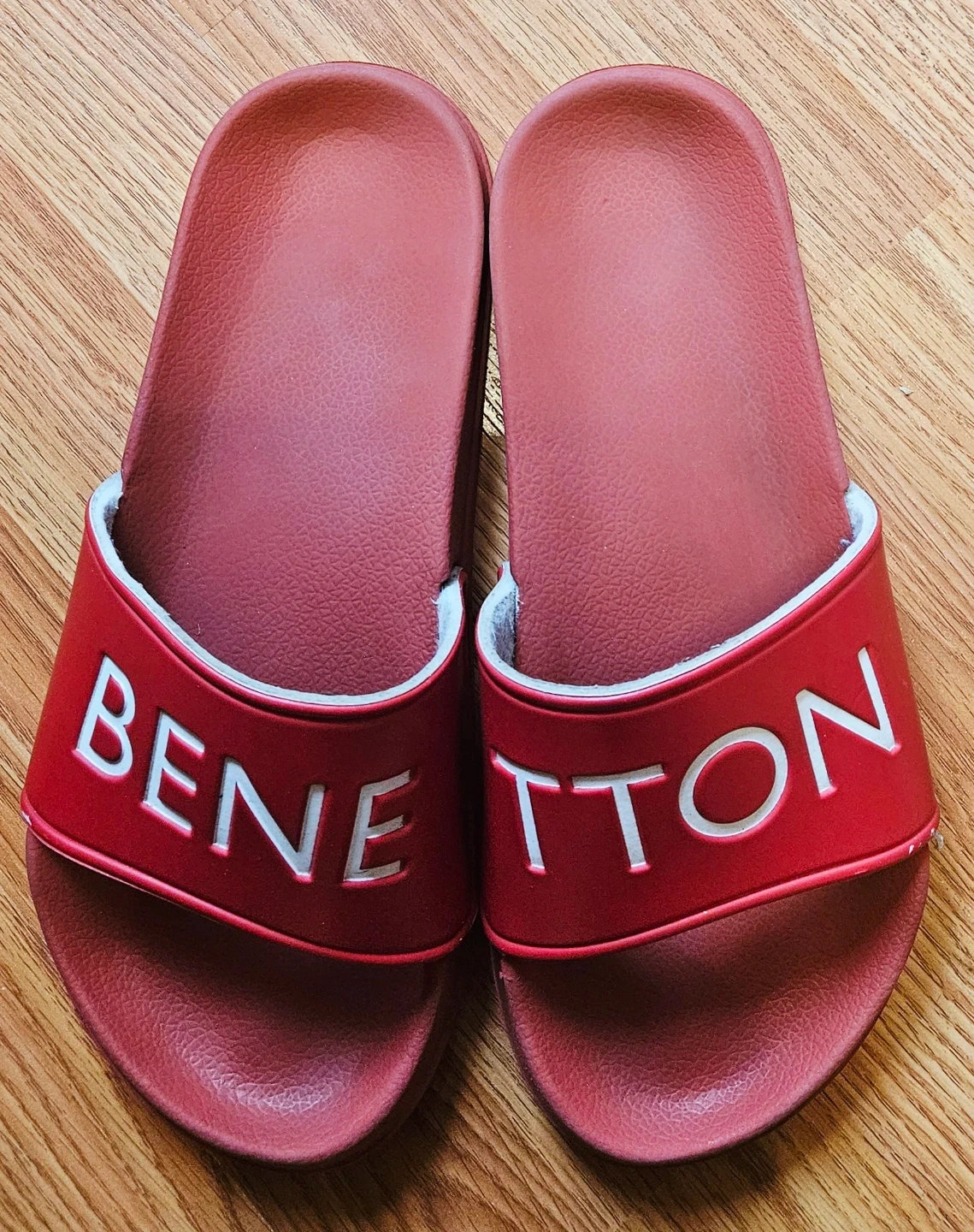 These red Benetton slides are comfy and stylish. The soles measure approximately 11 inches long. They're a great option for warm weather!