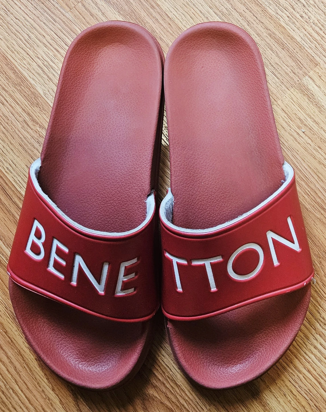 These red Benetton slides are comfy and stylish. The soles measure approximately 11 inches long. They're a great option for warm weather!