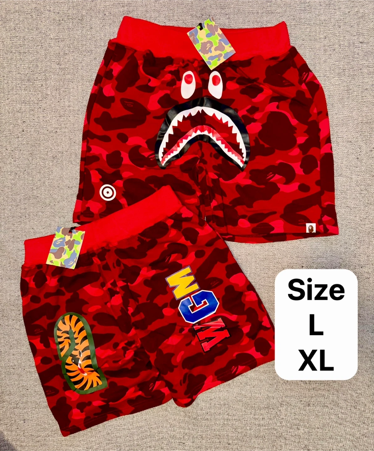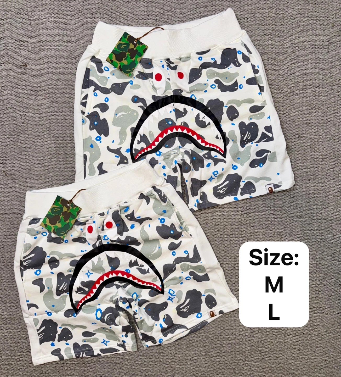 A pair of BAPE shorts featuring the iconic shark face graphic and camouflage pattern. Available in multiple colors and sizes.