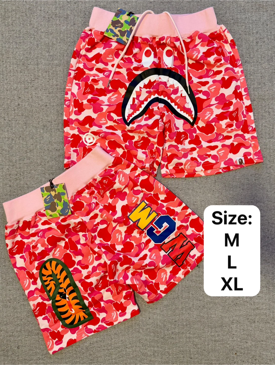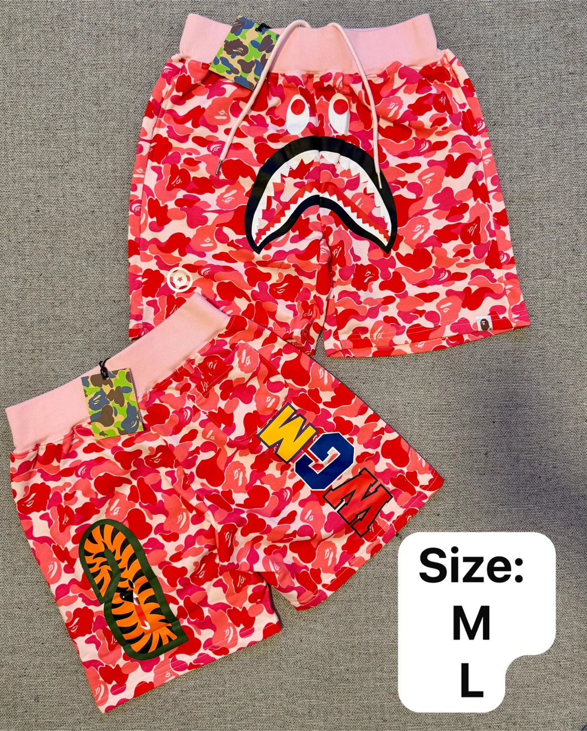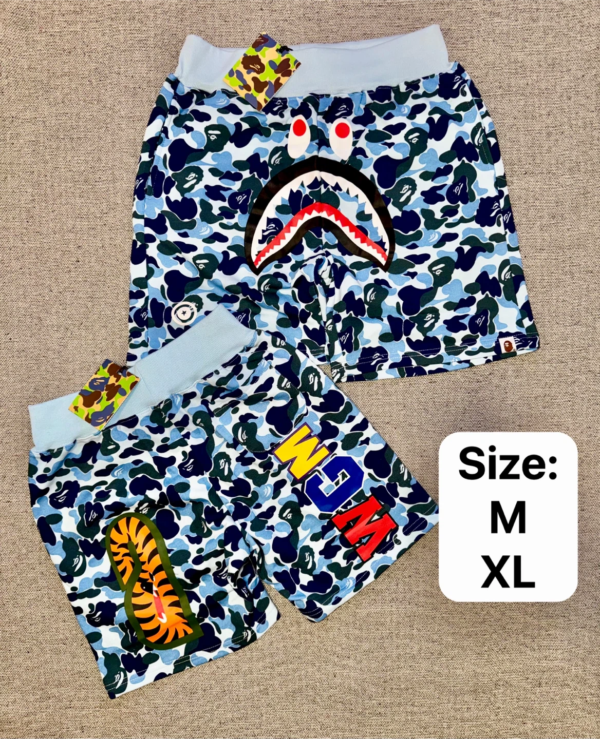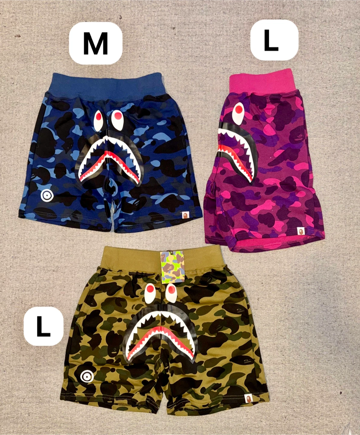 A pair of BAPE shorts featuring the iconic shark face graphic and camouflage pattern. Available in multiple colors and sizes.