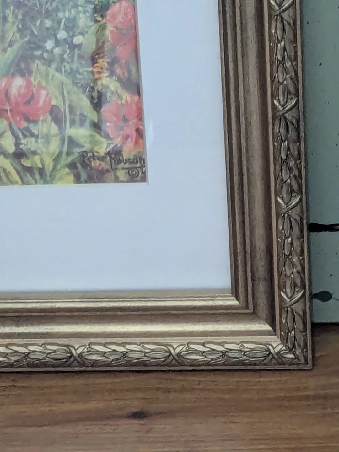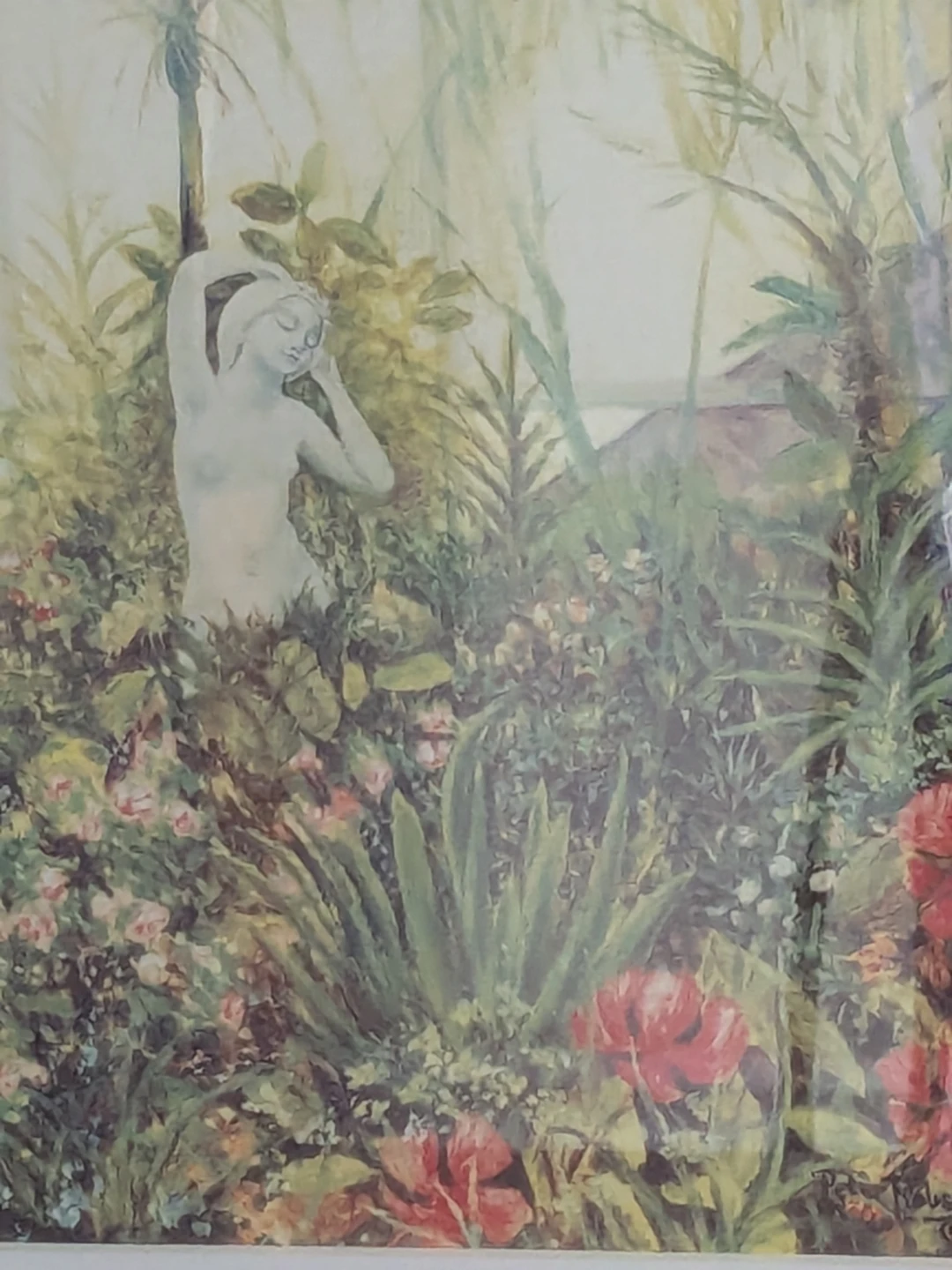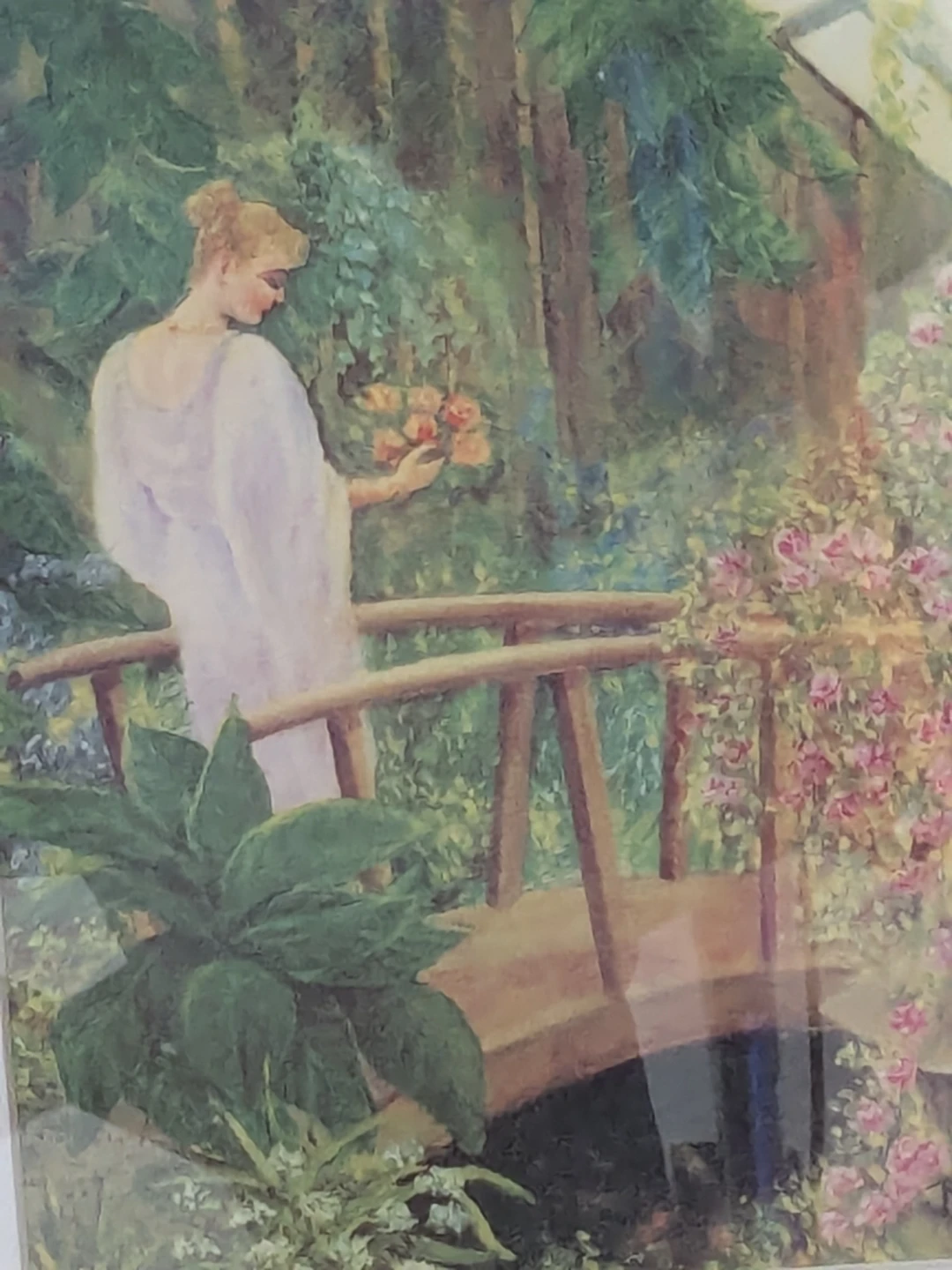 Two framed art prints featuring serene garden scenes with classical figures. Each print showcases lush greenery and floral details. Comes in ornate gold-tone frames. Measurements are