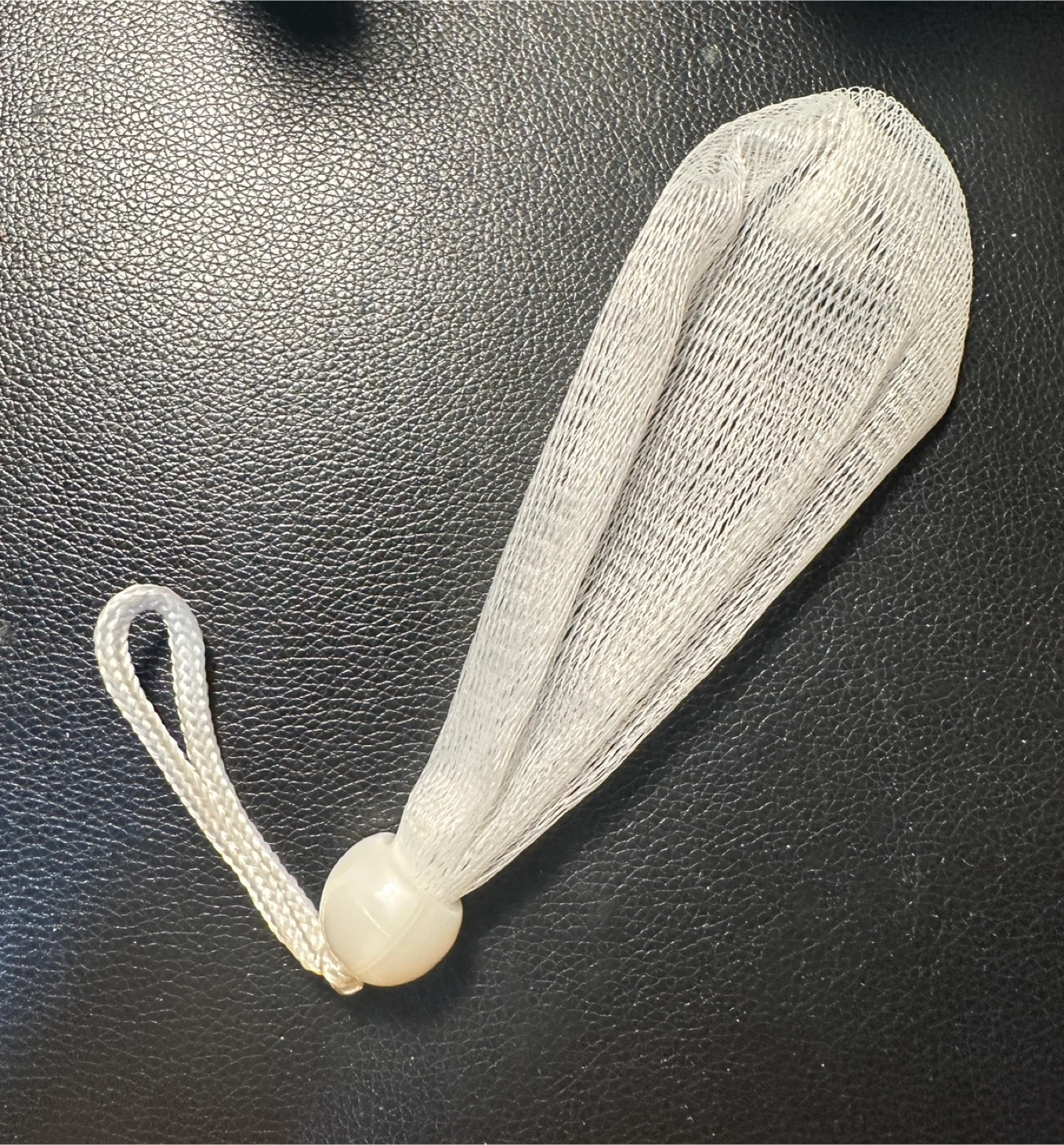 Here's a white mesh bath sponge! It's in good condition and ready for a new home in your bathroom. Perfect for exfoliating and lathering up your favourite soap