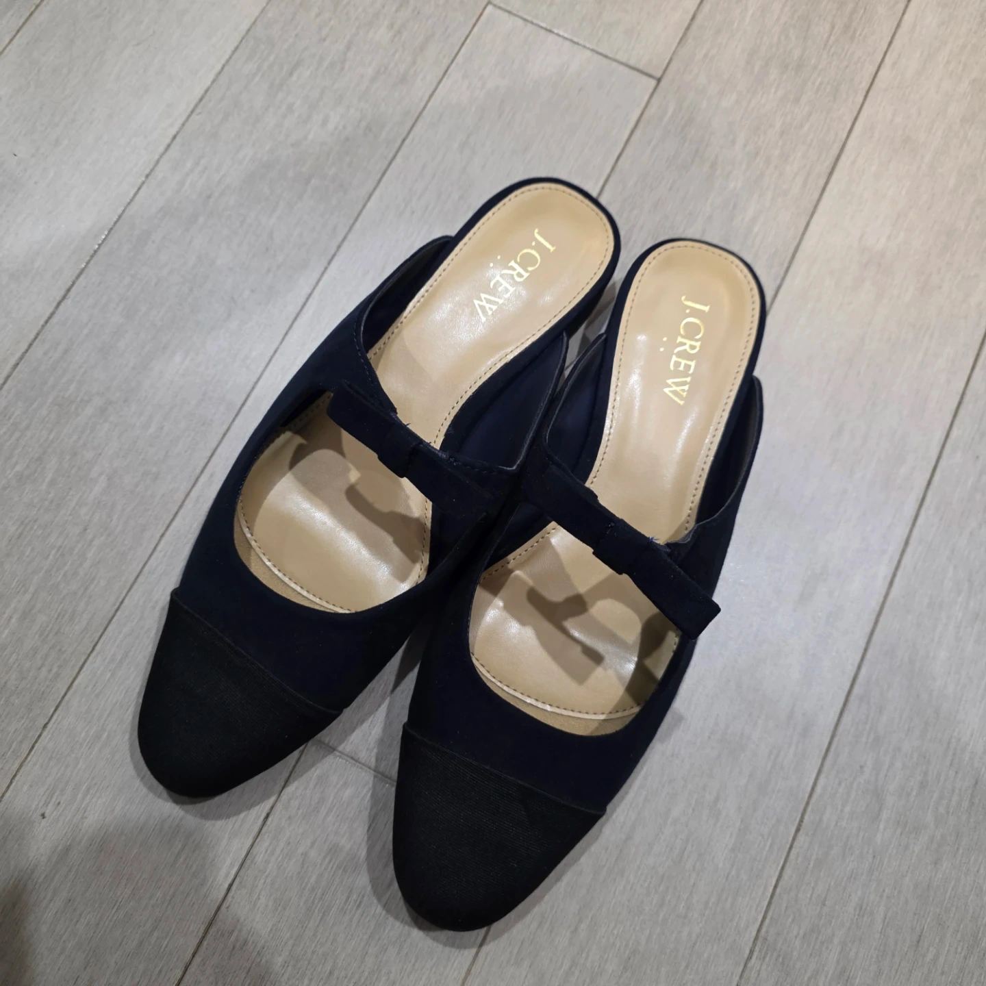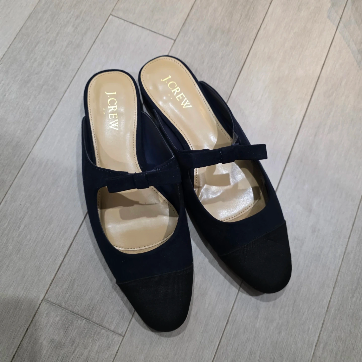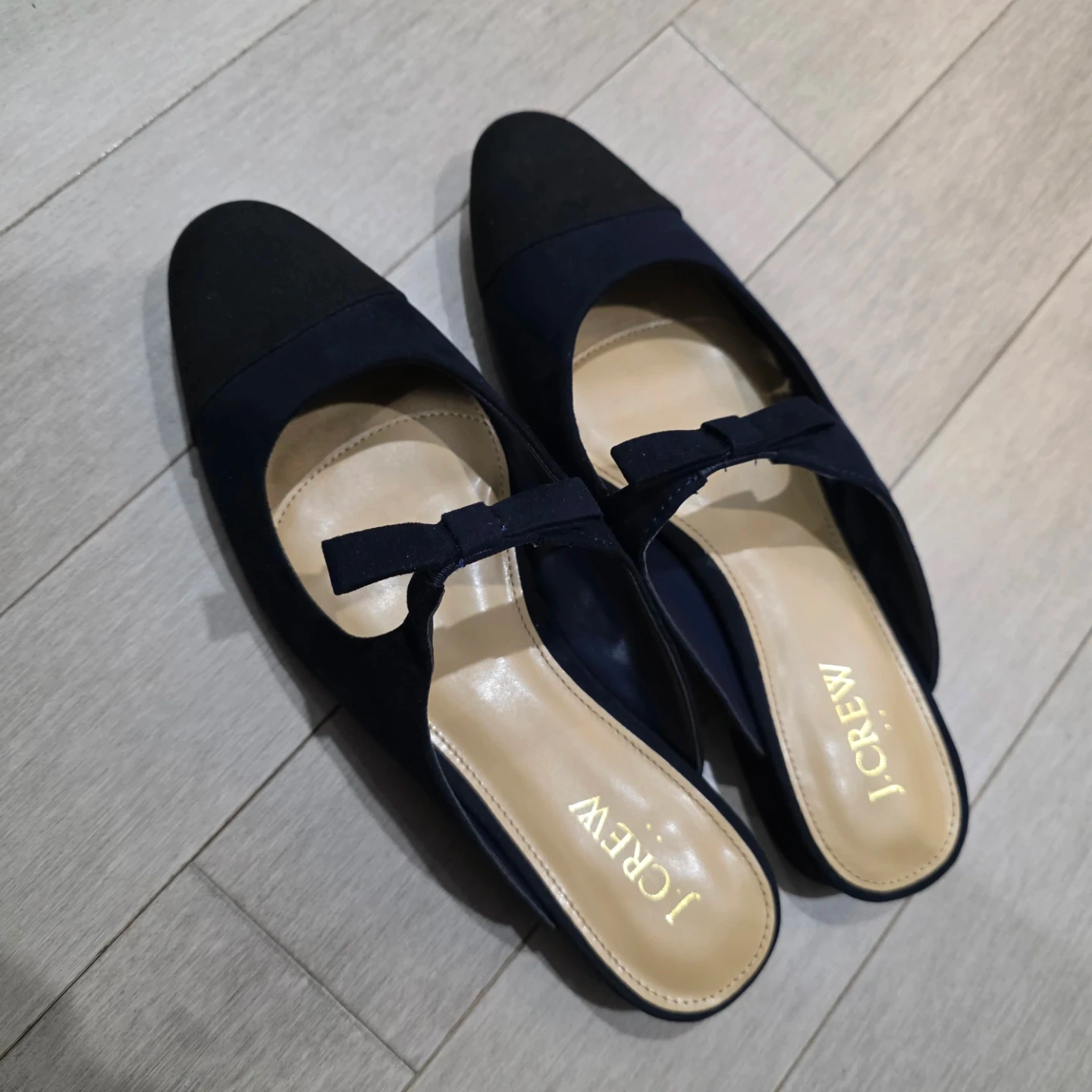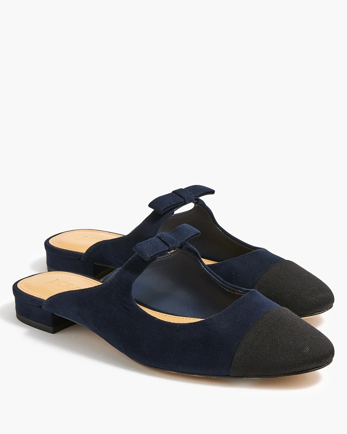 Navy suede mules from J. Crew. These feature a black cap toe and a decorative bow accent. Slip-on style for easy wear.