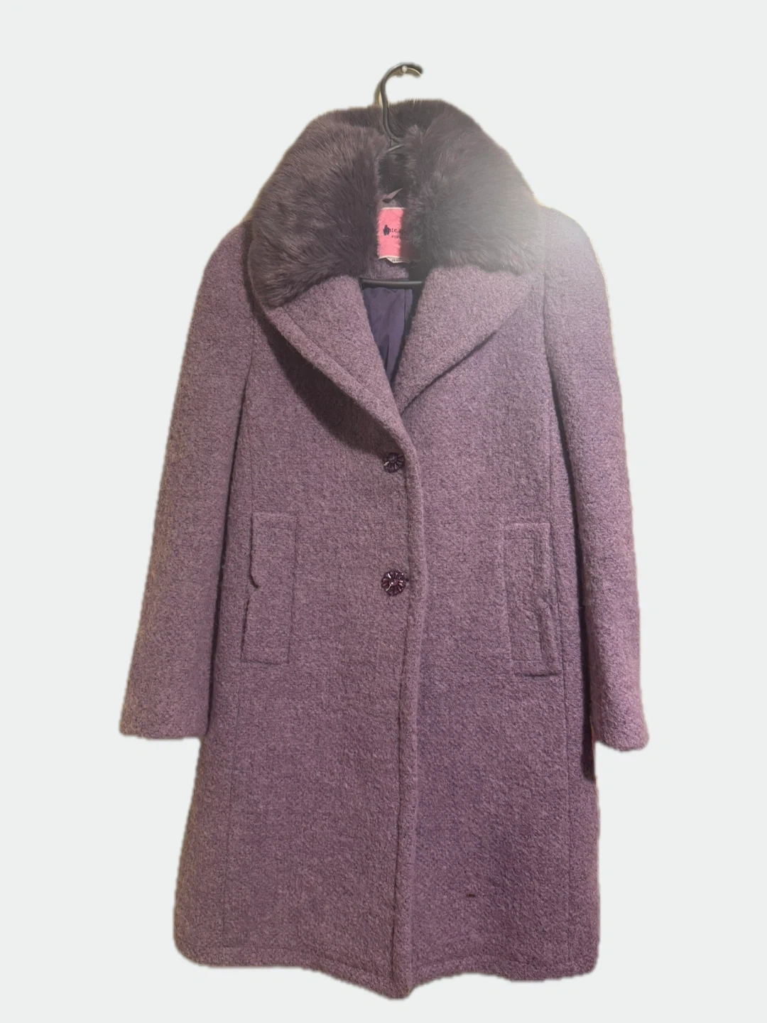 Chic Kate Spade New York wool blend coat in a lovely purple hue. It features a detachable faux fur collar and stylish button closures. This elegant coat is perfect for staying warm and fashionable during cooler weather.