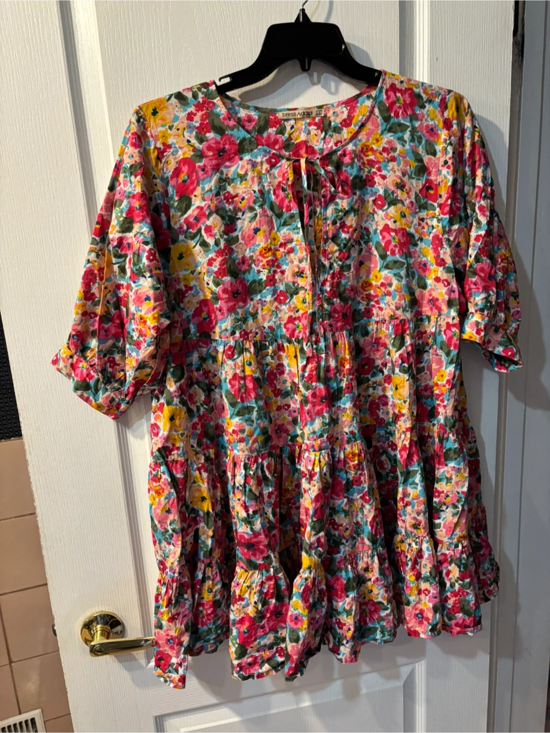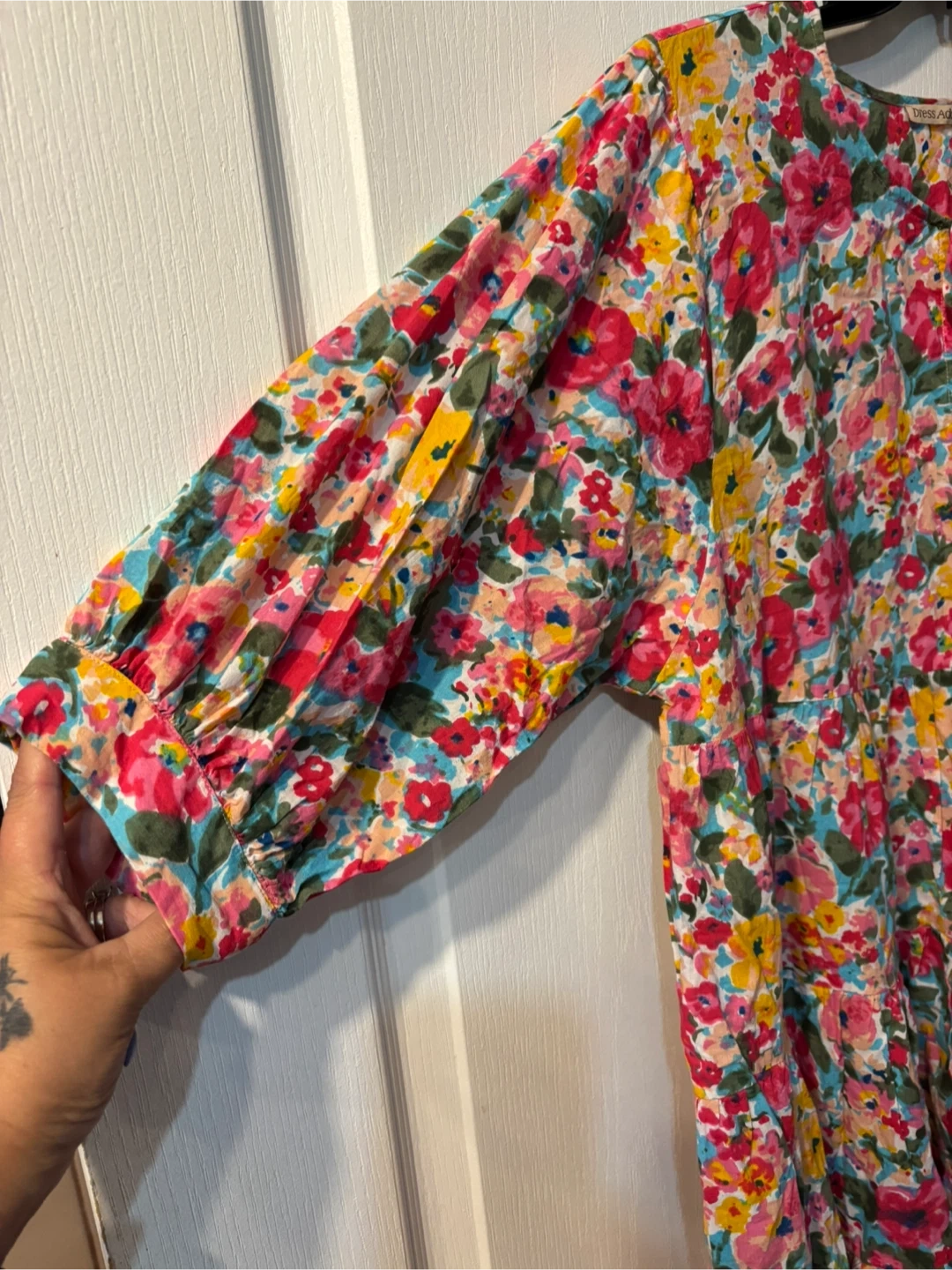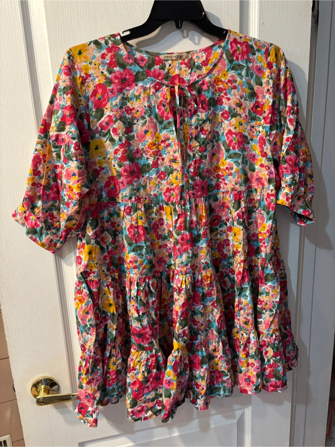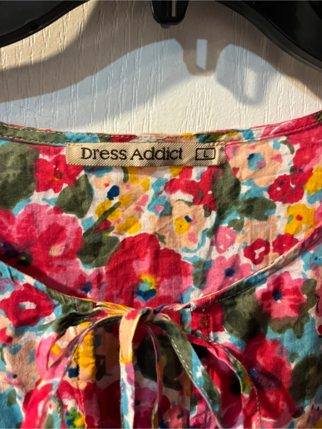 Selling a cute Dress Addict dress in size L! It features a vibrant floral pattern that's perfect for spring or summer. The dress has a tiered design and a comfortable fit.