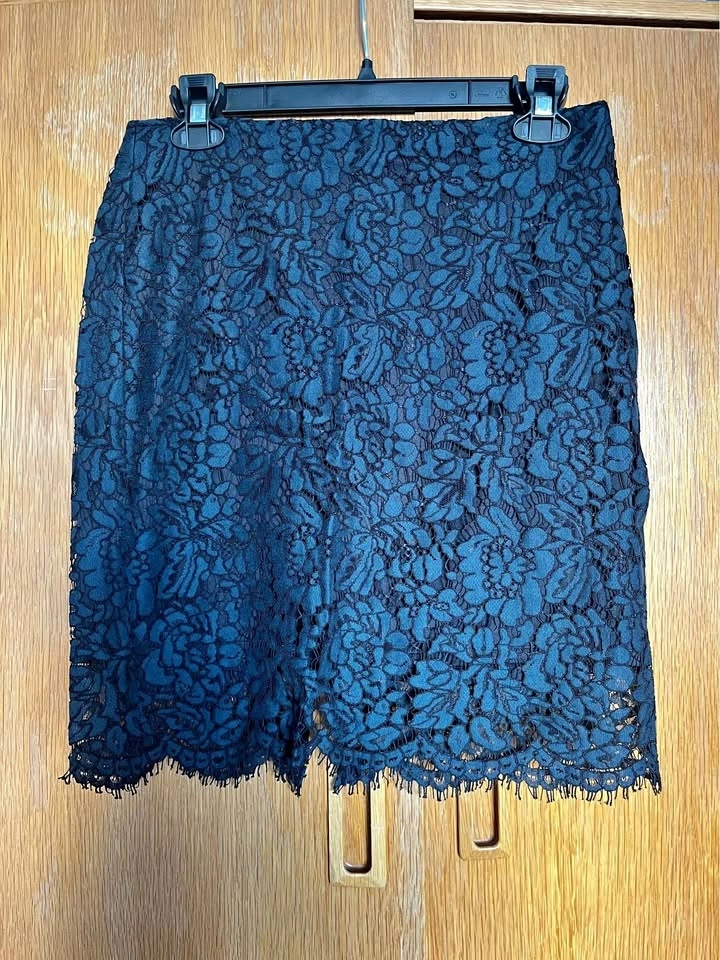 Navy lace pencil skirt with intricate floral overlay. Scalloped hem adds feminine detail. Sleek, tailored silhouette for polished outfits. Size 4. In great condition.
