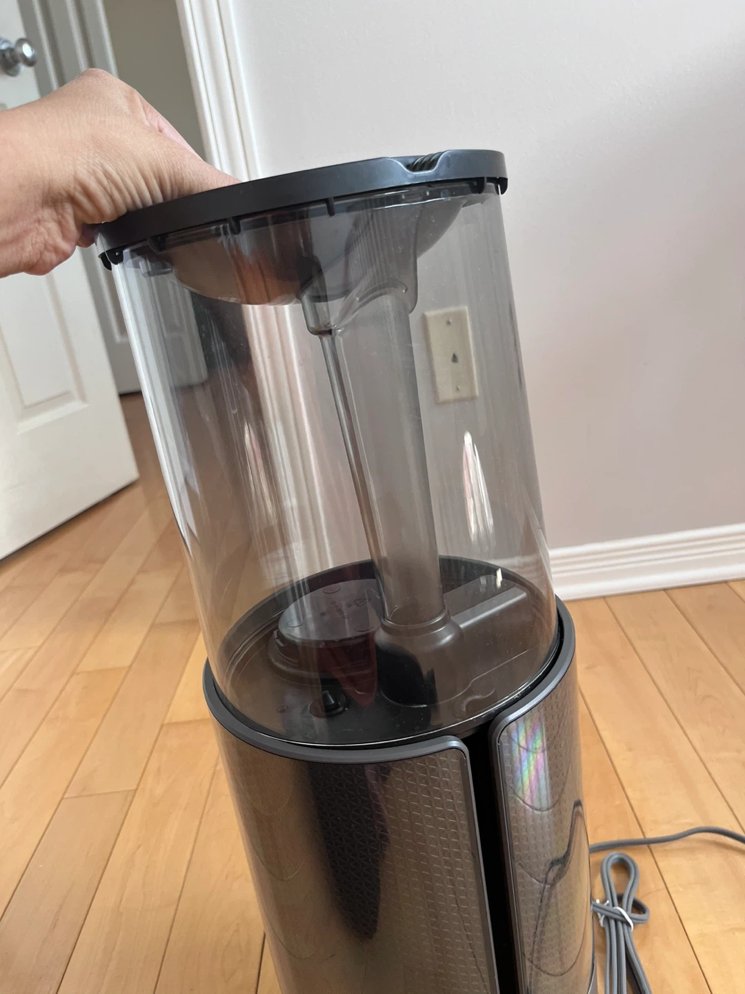 This Honeywell air purifier features a sleek, modern design. It's perfect for improving air quality in your home. The unit is cylindrical and comes with a power cord.