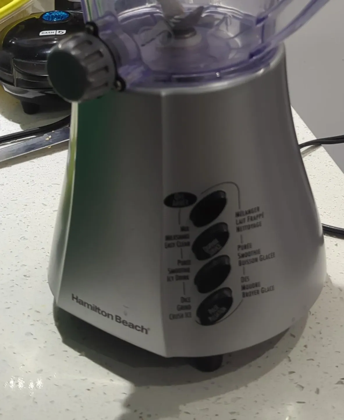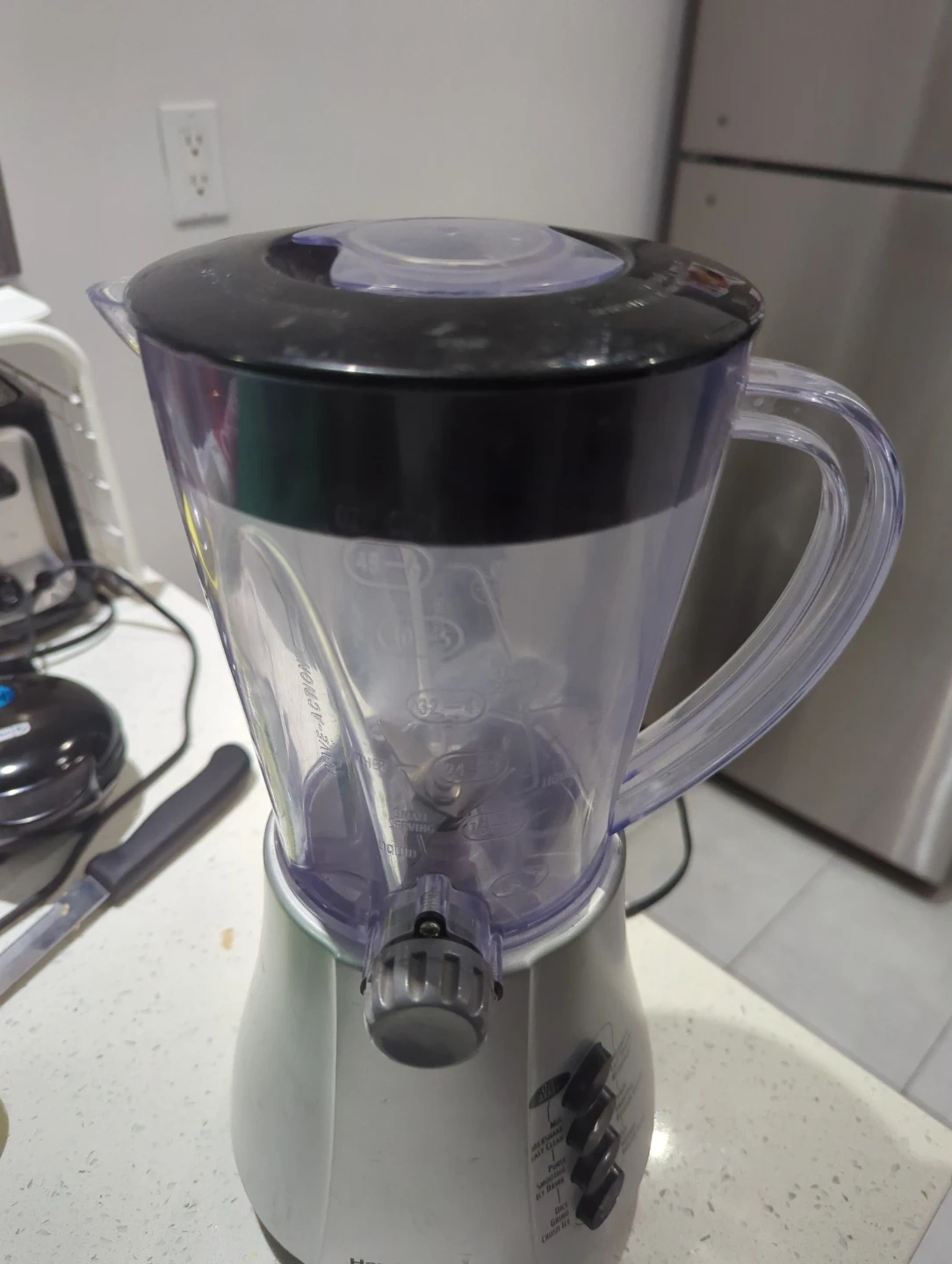 This Hamilton Beach blender has multiple settings including mix, puree, and crush ice. It's great for making smoothies and milkshakes. The pitcher is clear plastic with measurement markings.
