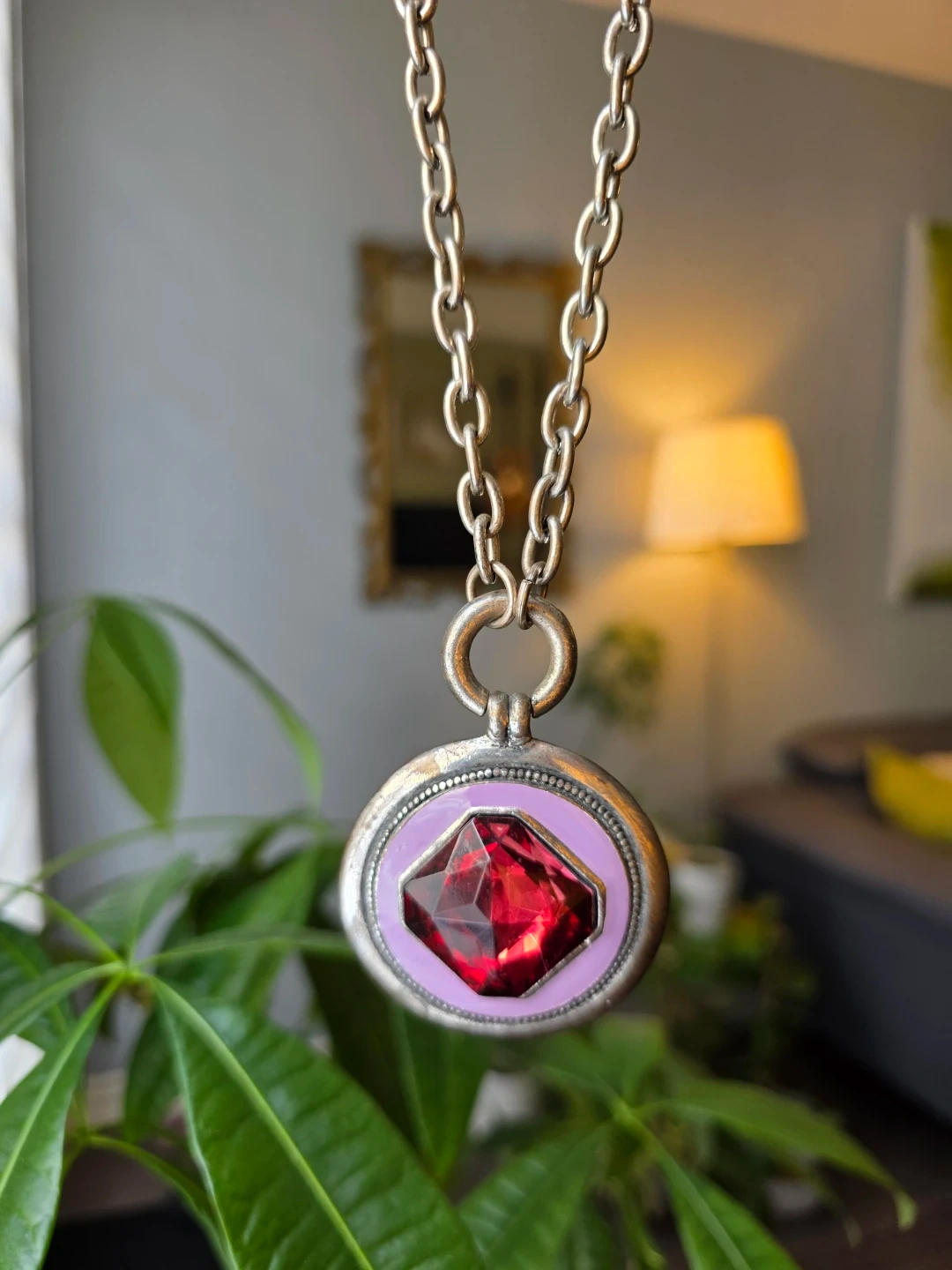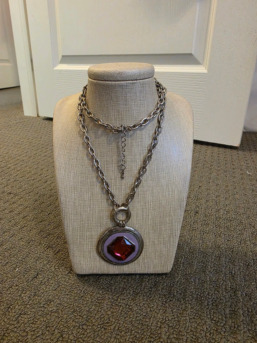 Silver tone necklace with a round pendant featuring a purple/red gemstone. The chain is long and has a substantial link design. A nice accessory for any outfit!