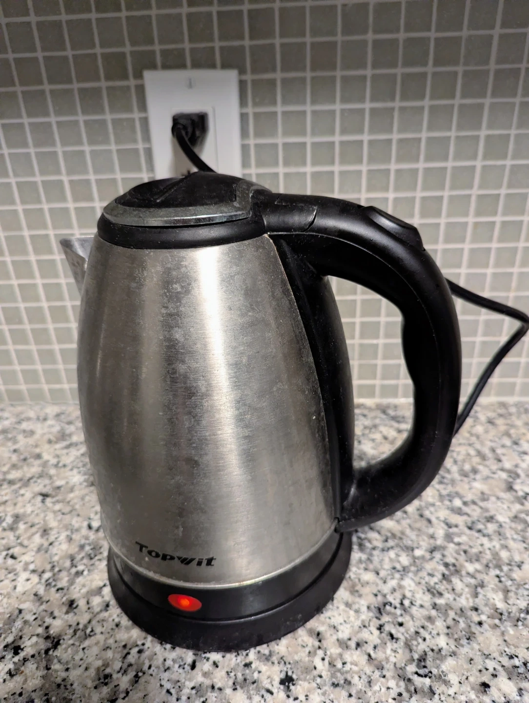 This TopWit electric kettle is made of stainless steel and has a black handle. It features a red indicator light when it's on. Simple and functional for quick boiling.