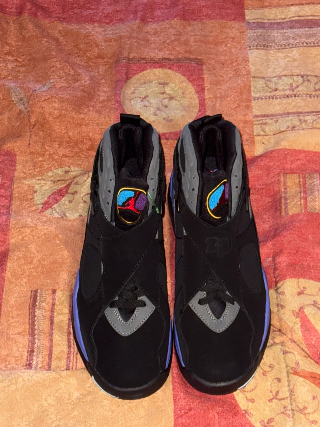 Classic Air Jordan 8 Retro sneakers. These kicks come in a black, grey, blue, and purple colourway. They're designed for comfort and style.size is 9.5 men