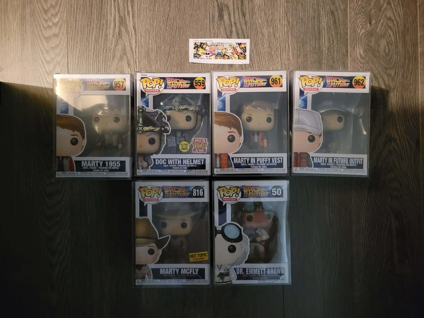 Set of six Funko Pop! vinyl figures from the Back to the Future movies. Includes Marty McFly in different outfits, Doc Brown with helmet, and Dr. Emmett Brown. These collectible figures are great for any fan!