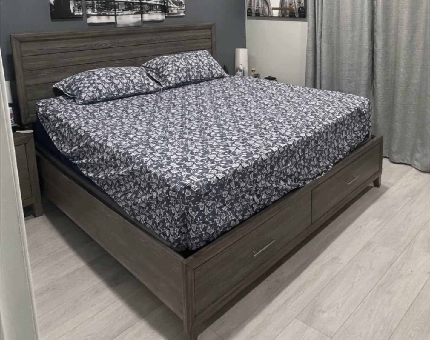 This king bed frame has a gray wood finish and two storage drawers at the foot. Its dimensions are 85.5" L x 79" W x 52.5" H. It supports up to 800 lbs.