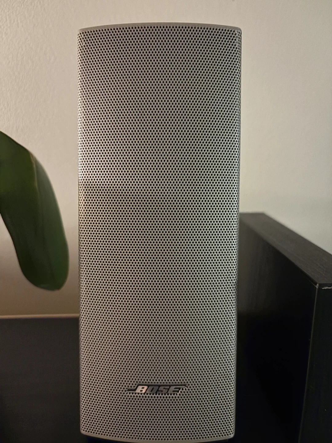 provides room-filling sound for music and streaming audio. It includes two speakers and a control pod. Silver colour.