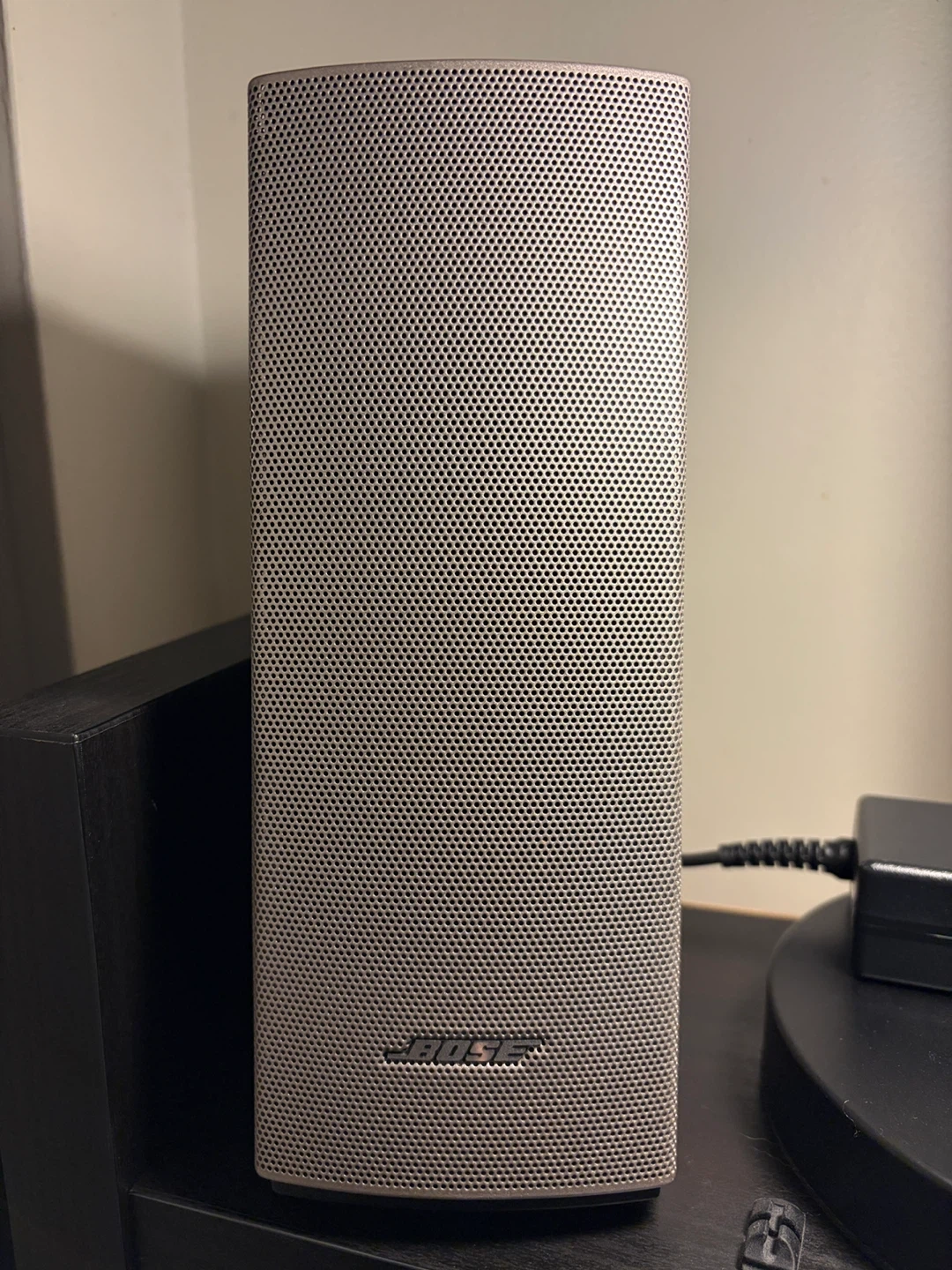 provides room-filling sound for music and streaming audio. It includes two speakers and a control pod. Silver colour.