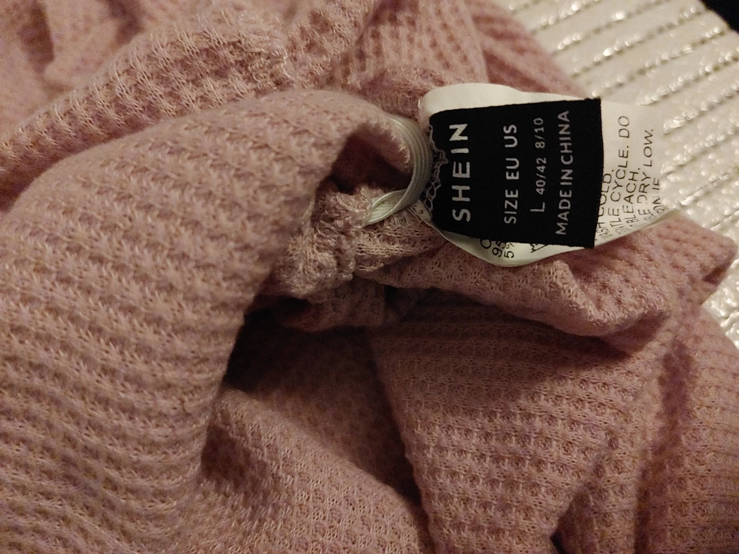 This is a SHEIN sleeveless mock neck top in a pretty pink colour. It's a size Large with a waffle knit texture. It's made from a soft fabric that feels comfy to wear!