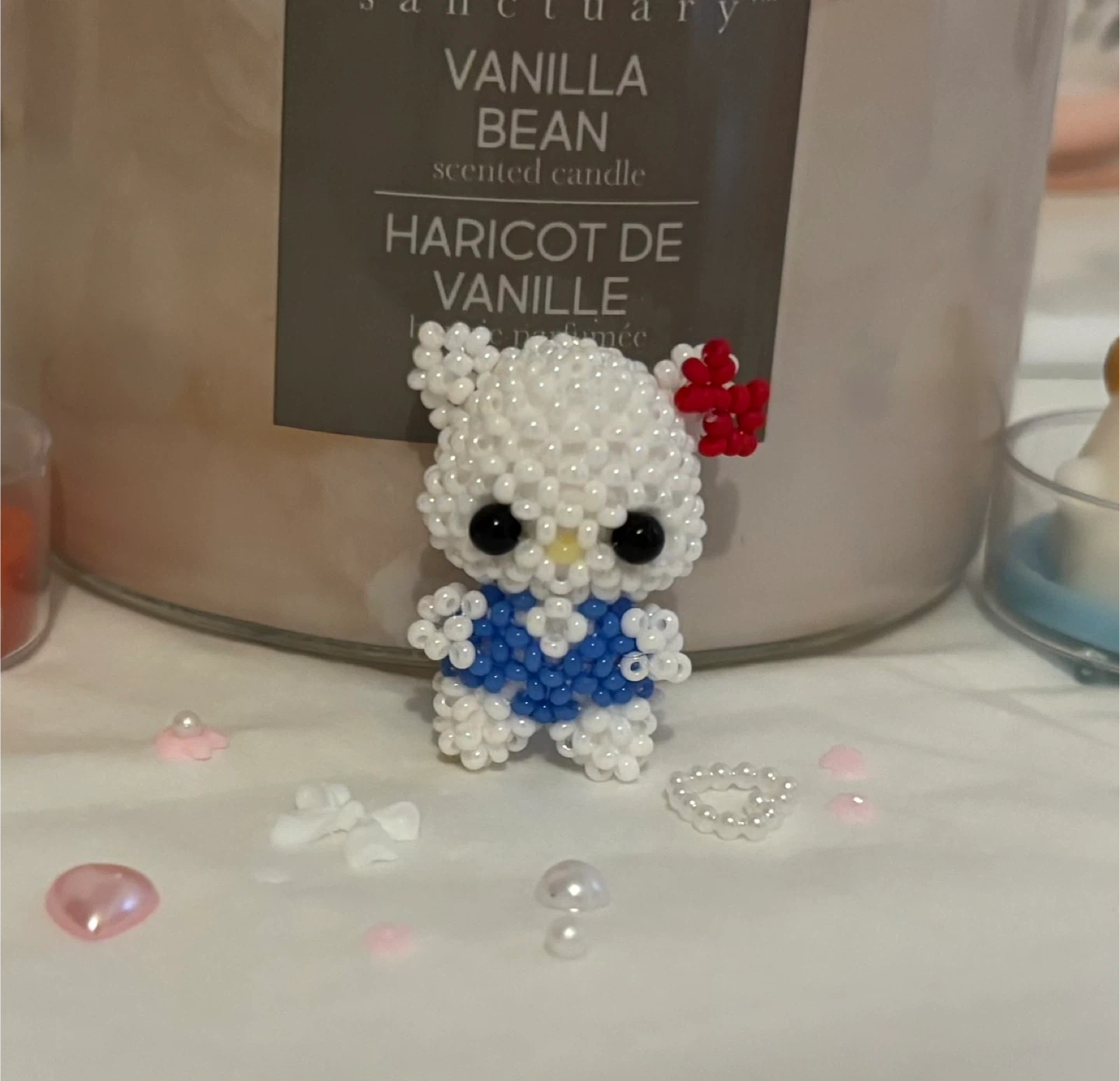 This is a cute beaded charm of Hello Kitty. It's made from small white and blue beads with a red bow. It has a white strap for hanging.