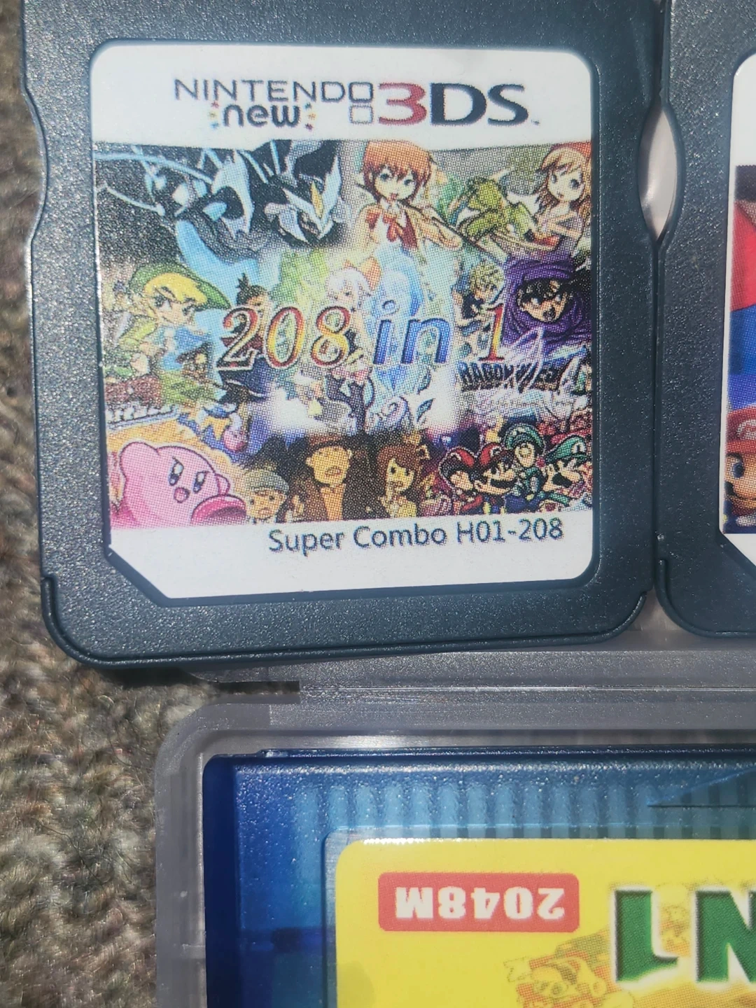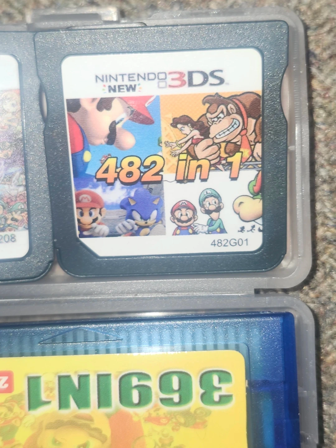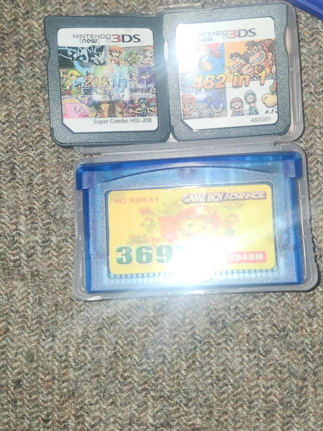 Bundle of three multi-game cartridges: one for Nintendo DS with 208 games and another for Nintendo DS with 482 games in 1. Also includes a Game Boy Advance cartridge with 369 games in 1. These cartridges offer a wide variety of gaming options for classic and newer handheld consoles.