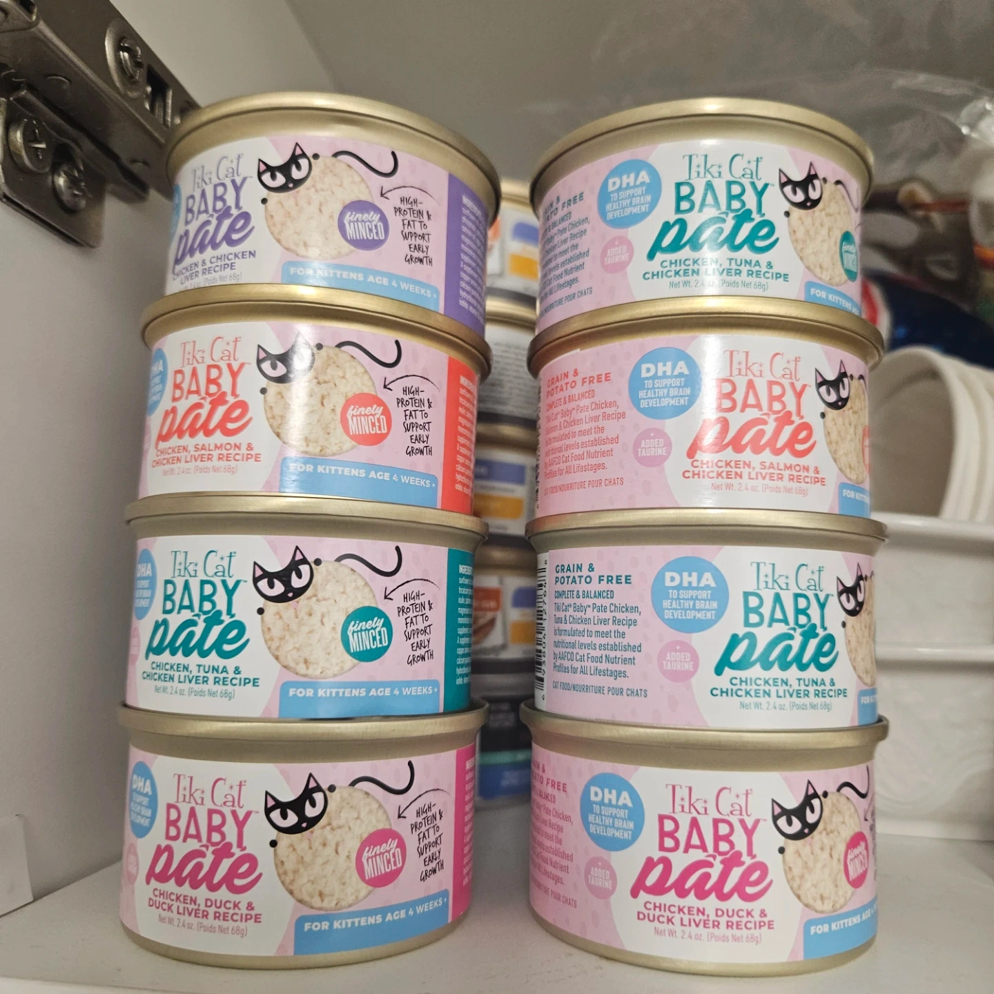 This is Tiki Cat Baby Pate kitten food, available in Chicken & Chicken Liver, Chicken, Salmon & Chicken Liver, Chicken, Tuna & Chicken Liver, and Chicken, Duck & Duck Liver recipes. Each can is 2.4 oz and finely minced for easy feeding. It's formulated with high protein and fat to support early growth and includes DHA for healthy brain development. These are grain and potato-free recipes made for kittens age 4 weeks and up.