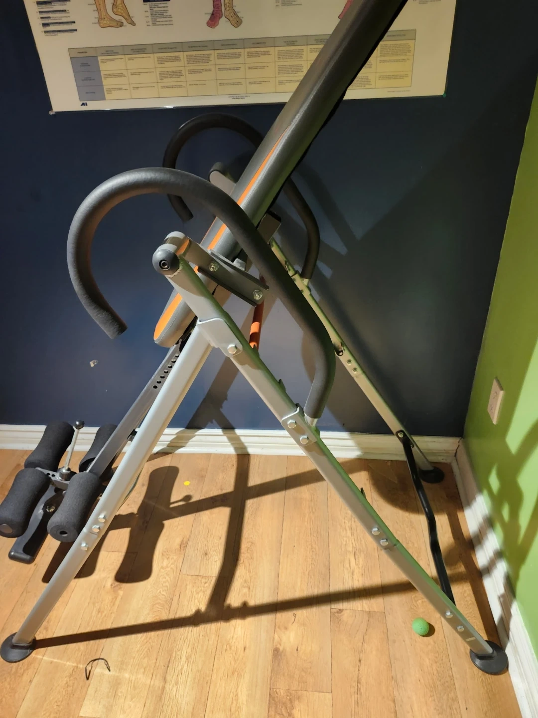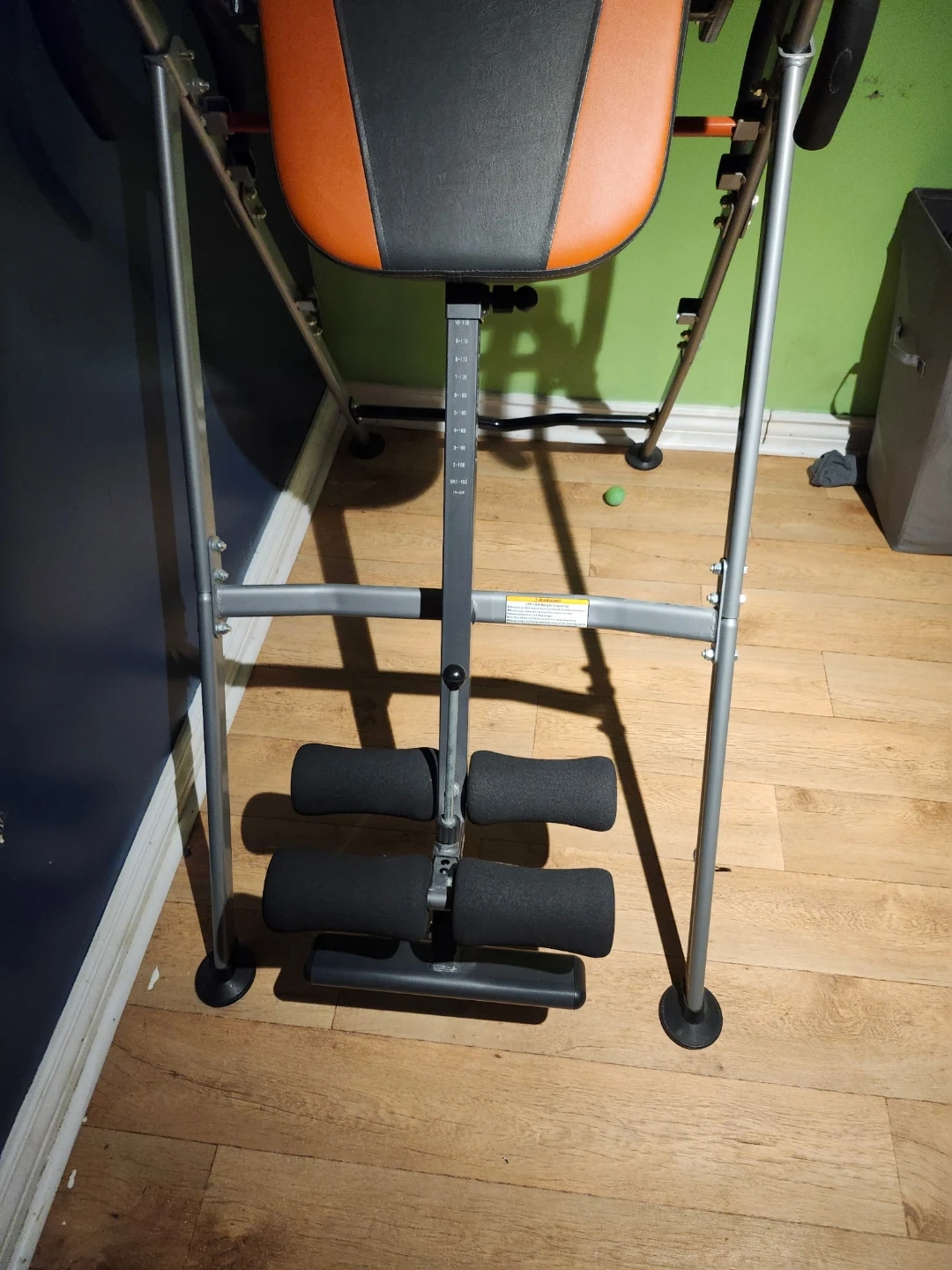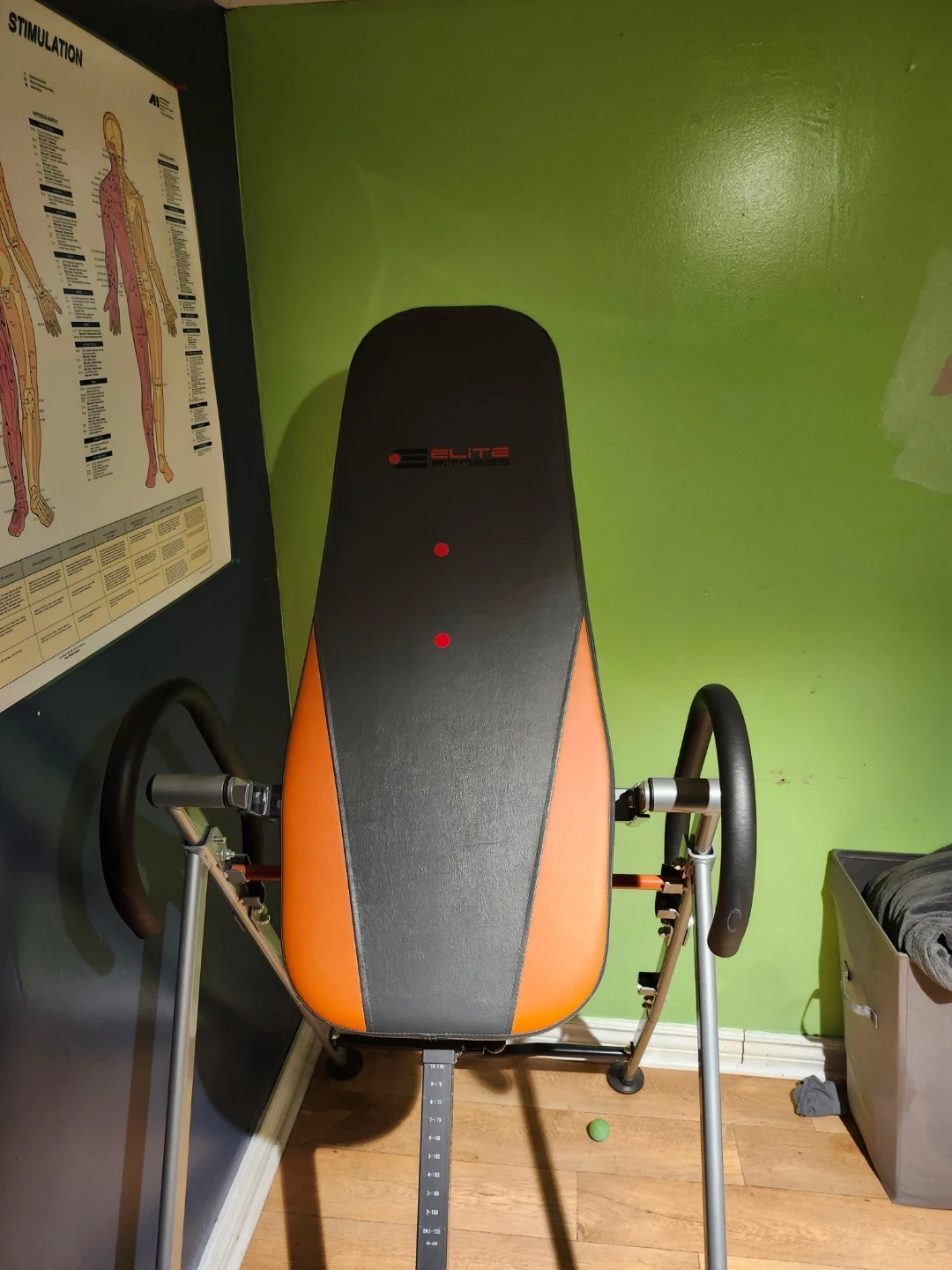 This Elite Fitness inversion table is designed for decompression and stretching. It has padded ankle supports and adjustable settings for different users. The weight capacity is 250 lbs.