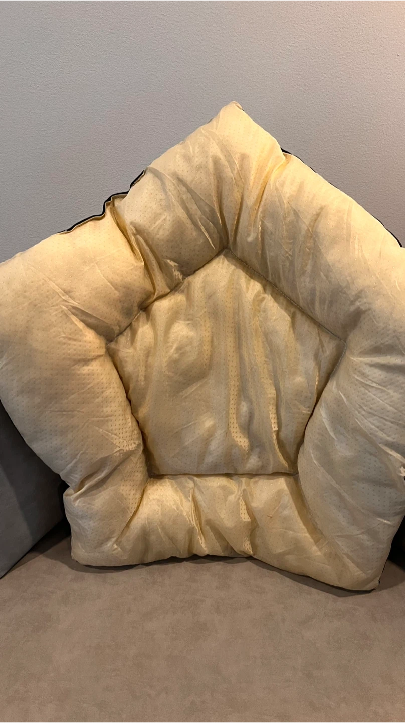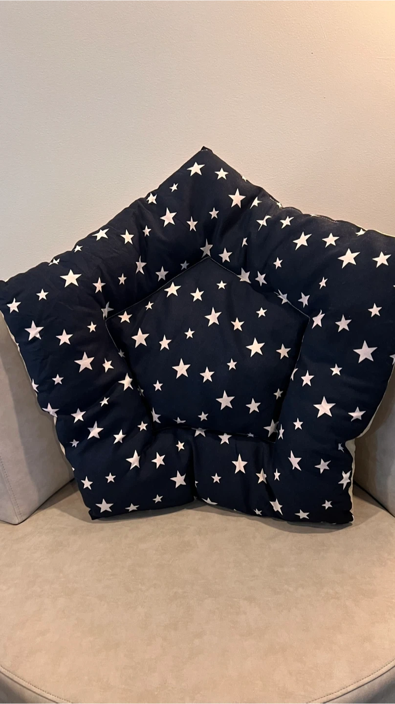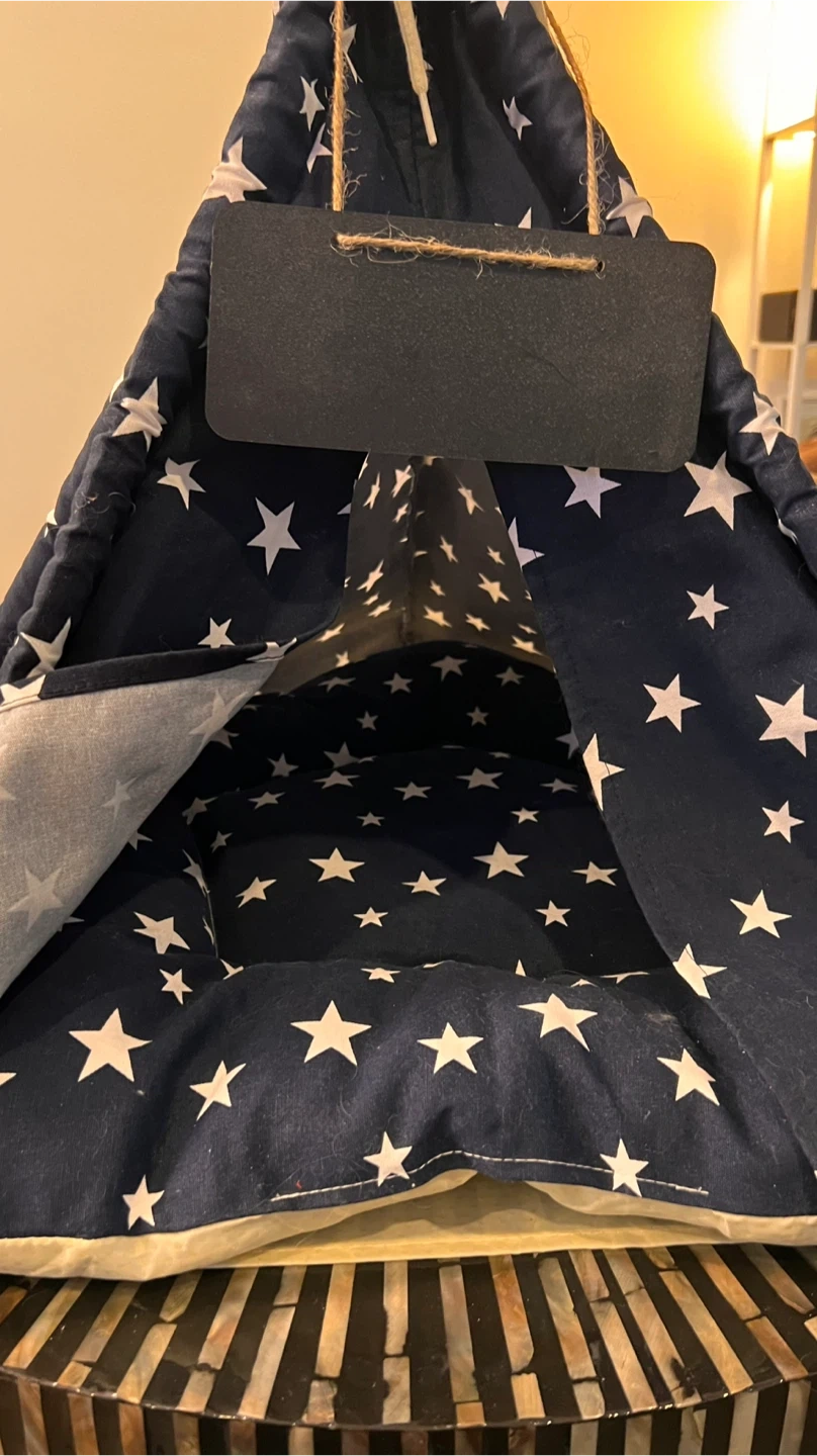 A cute navy blue teepee tent for pets, adorned with white stars. It includes a comfy, star-shaped cushion inside. Easy to assemble and perfect for small animals to nap or play in!